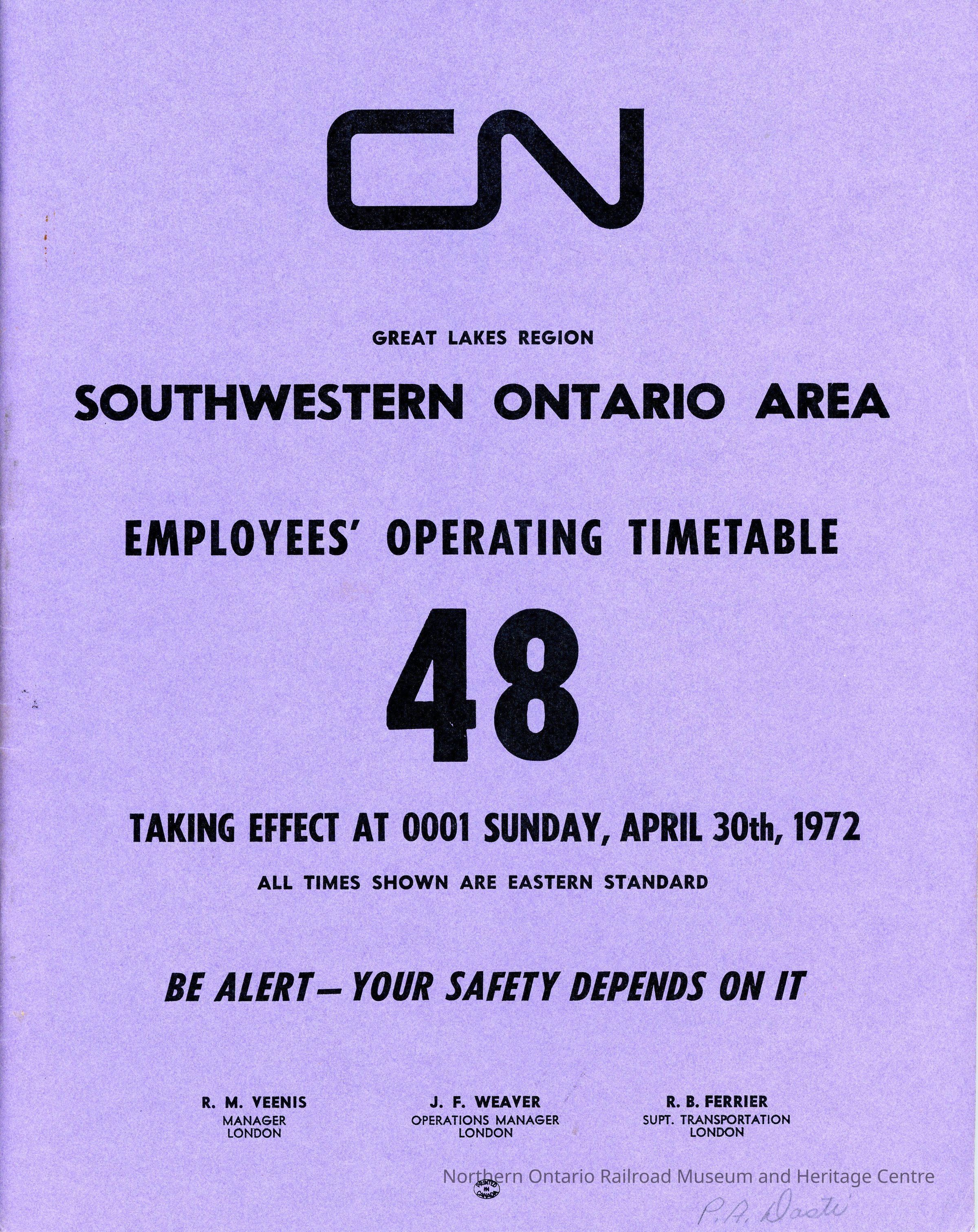 Timetables, CN Southwestern Ontario Area 48, April 30th 1972Collection