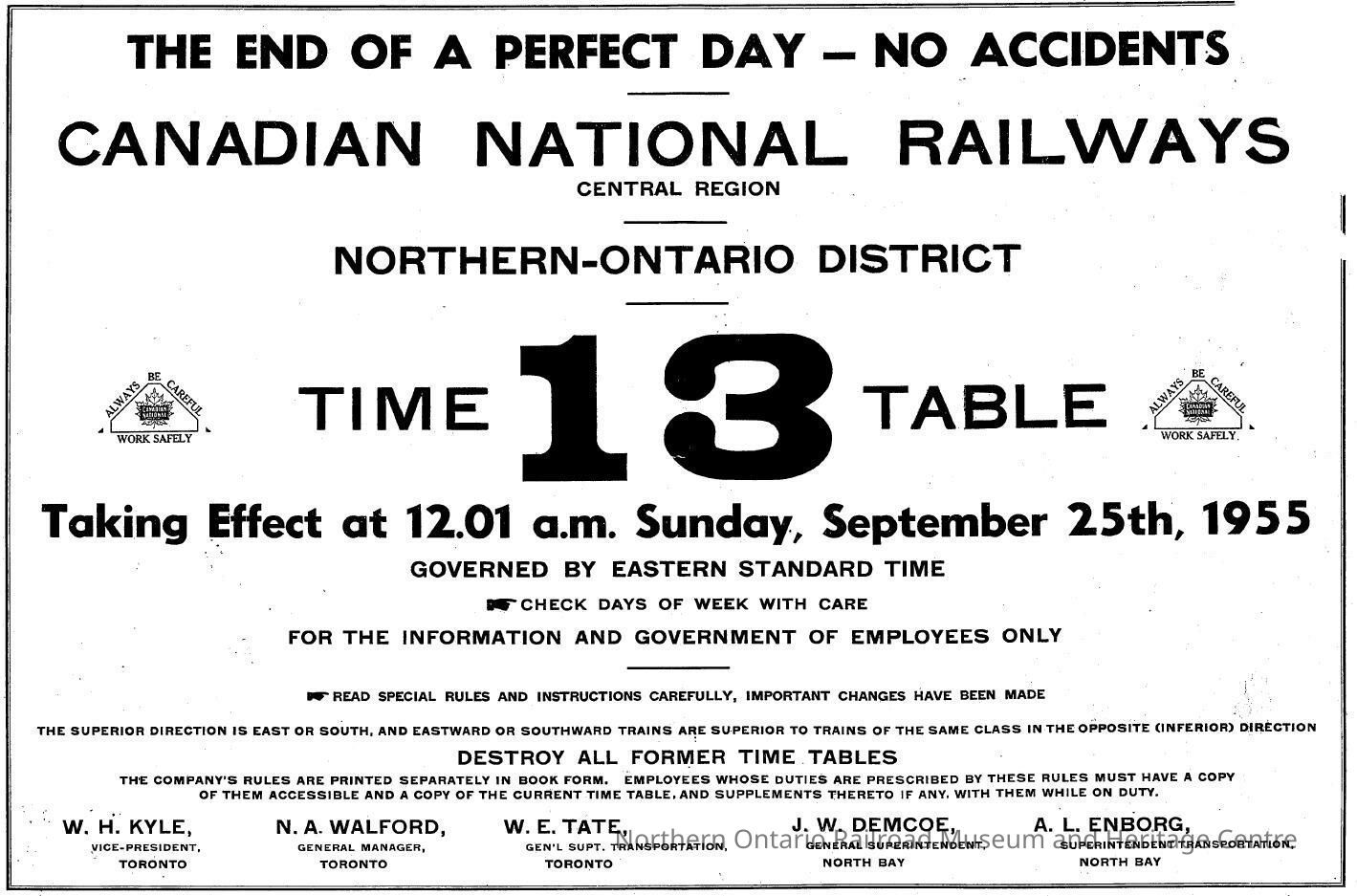 Timetables, CNR Northern-Ontario District 13, September 25th 1955.Collection