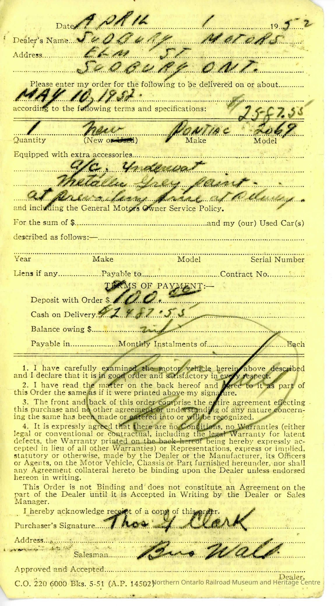 Tom Clark's order of a 1952 Pontiac 2069 Grand Prix, made May 10,1952 and fulfilled by Sudbury Motors. Paid $100.00 deposit, with $2487.55 cash to be paid on delivery. Car comes with"a/c, undercoat, Matallic Grey Paint, at pre-(?)"Collection