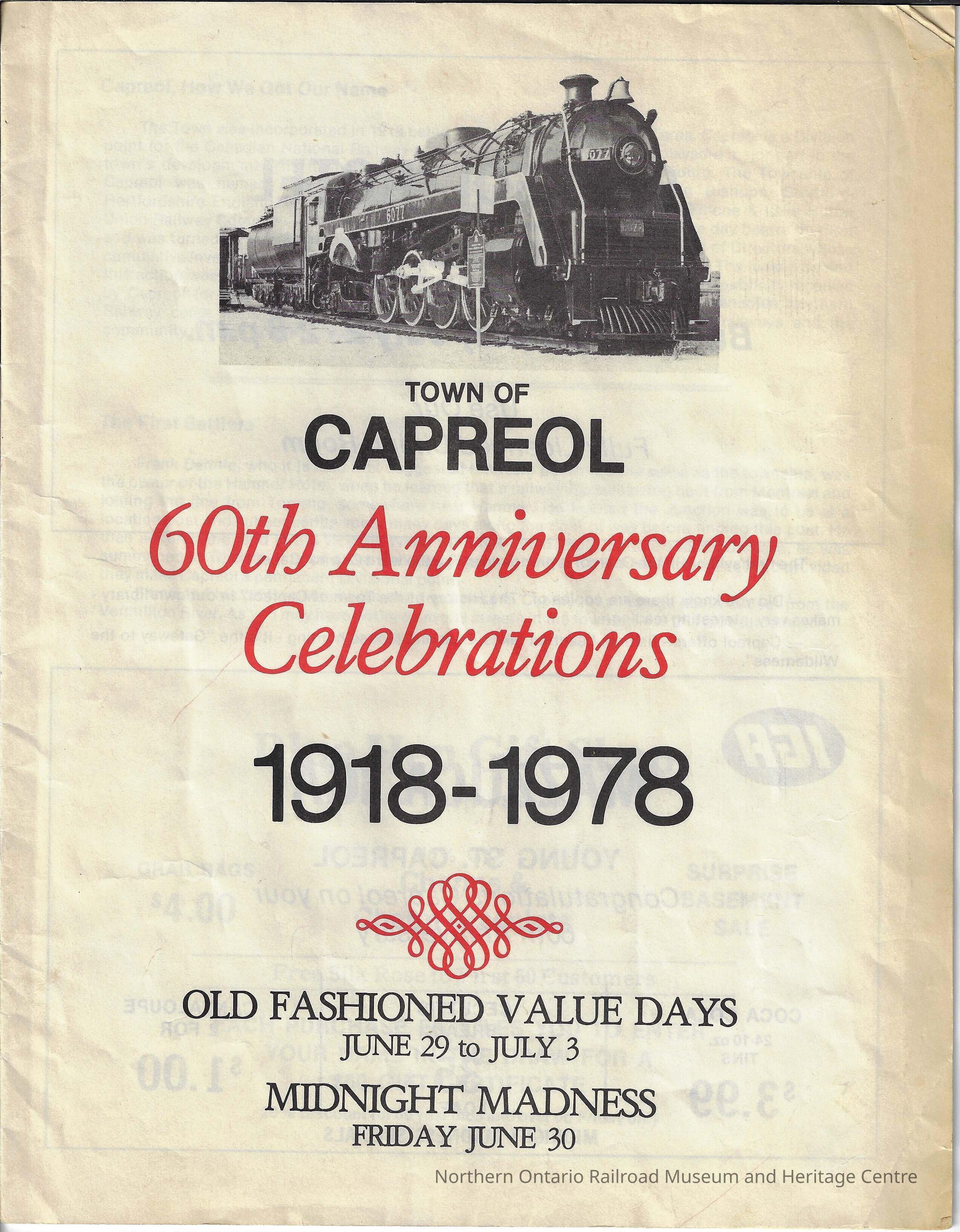 Town of Capreol 60th Anniversary Celebrations 1918-1978Entry/Object ID