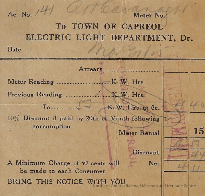 Town of Capreol Electric Lighting Department, Monthly Invoice: Art CavanaughtEntry/Object ID