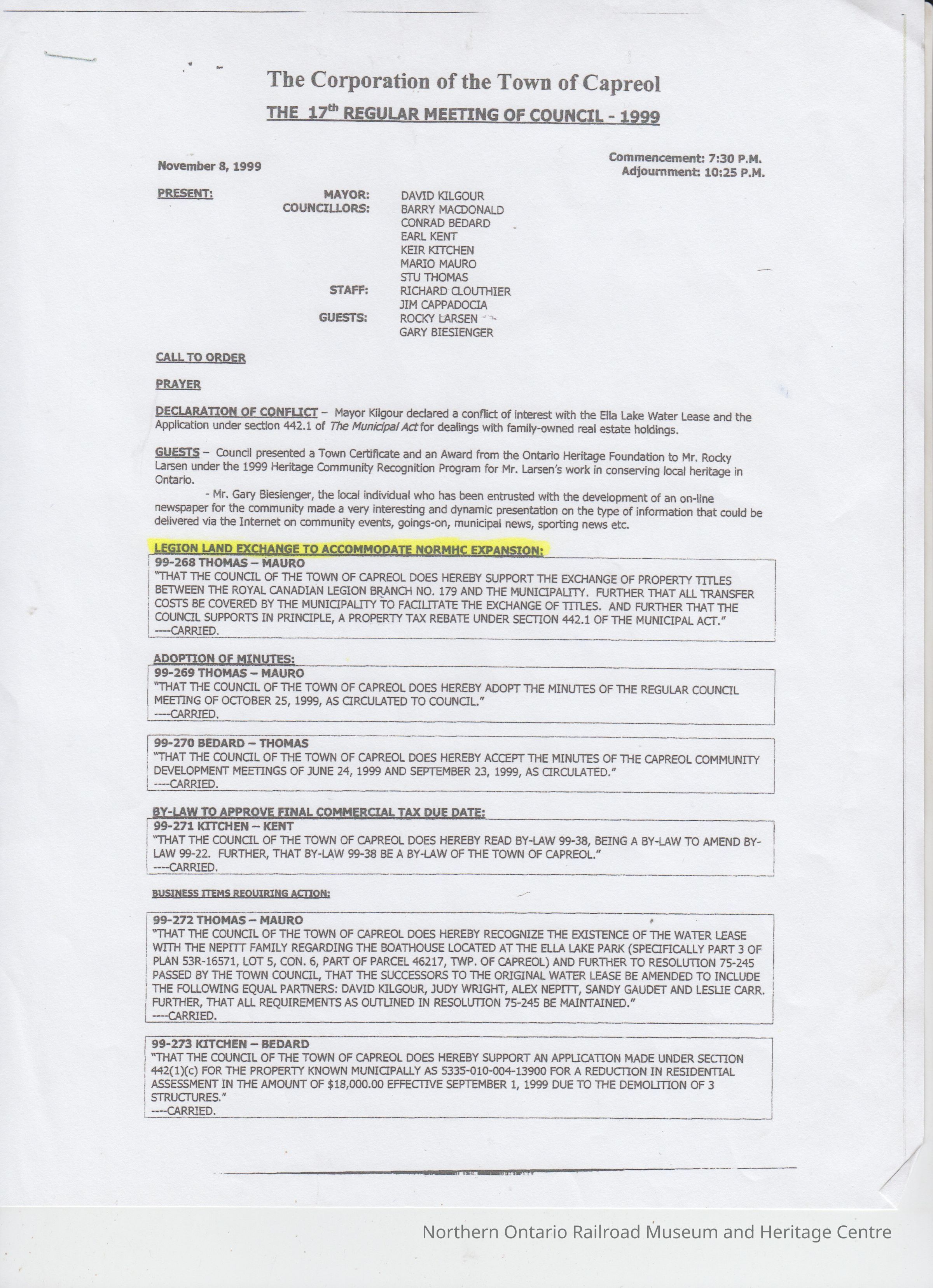 Town of Capreol Minutes: 17th Regular Metting of Council - 1999Collection