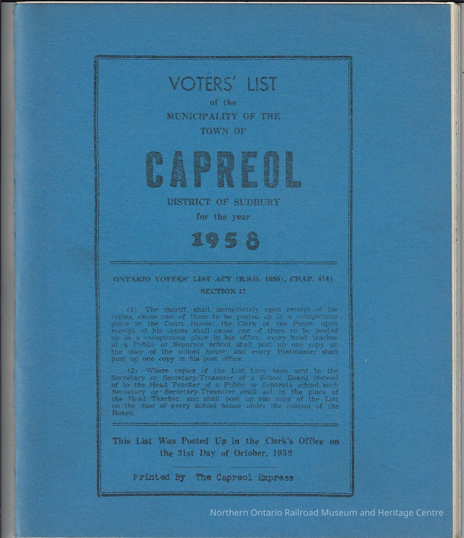 Booklet, containing the list of eligible voters for the election of 1958 in the Town of Capreol. The election was for the municipal election of 1958. The lists were posted in the Clerk's Office on October 31st, 1958. The lists contain: roll number, name, occupation, lot, concession or street, qualification, school, jurisdiction, for each eligible voter.