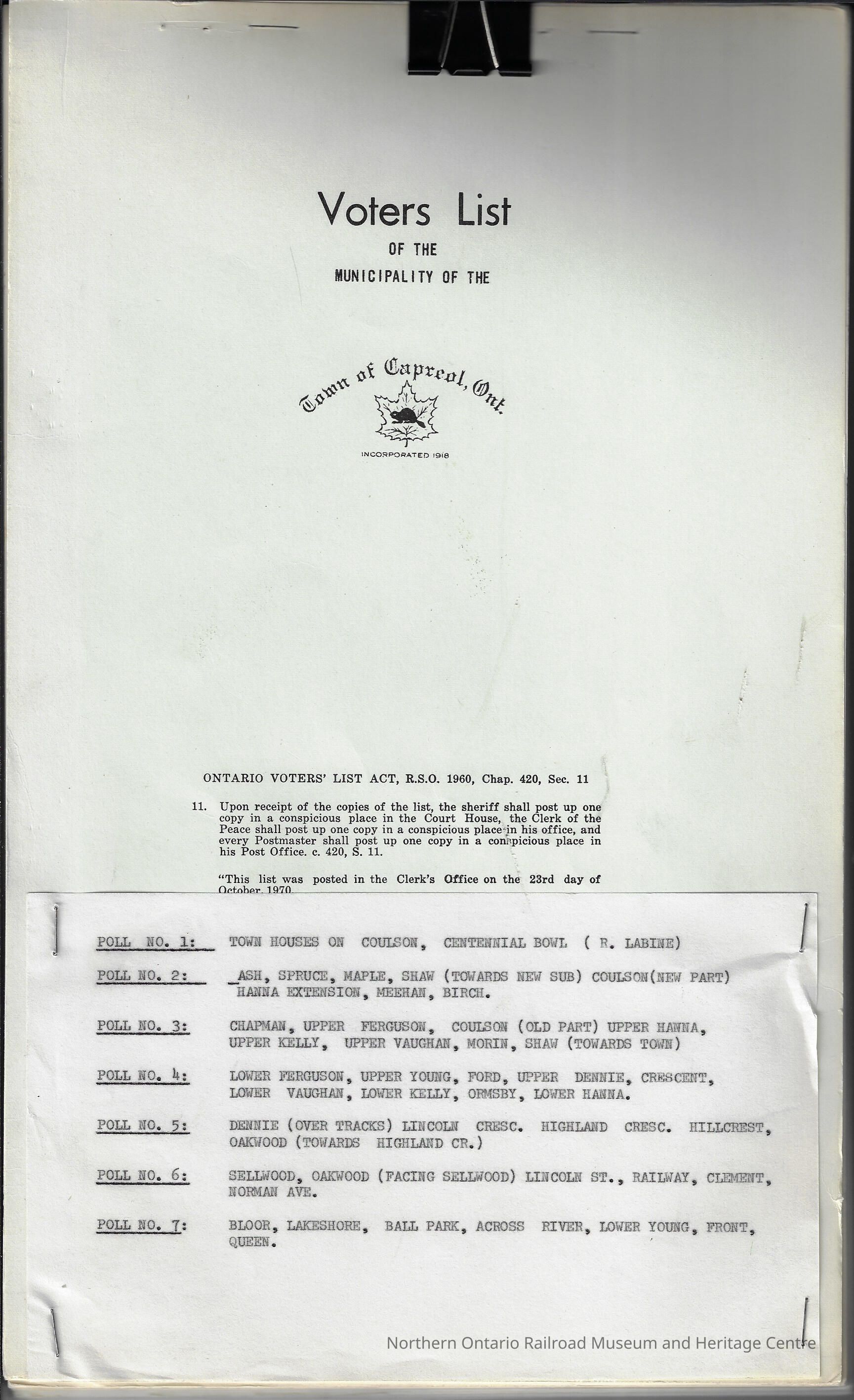 Booklet, containing the list of eligible voters for the election of 1960 in the Town of Capreol. The election was for the municipal election of 1960. The lists were posted in the Clerk's Office on October 23rd,1960. The lists contain: roll number, name, occupation, lot, concession or street, qualification, school, jurisdiction, for each eligible voter.