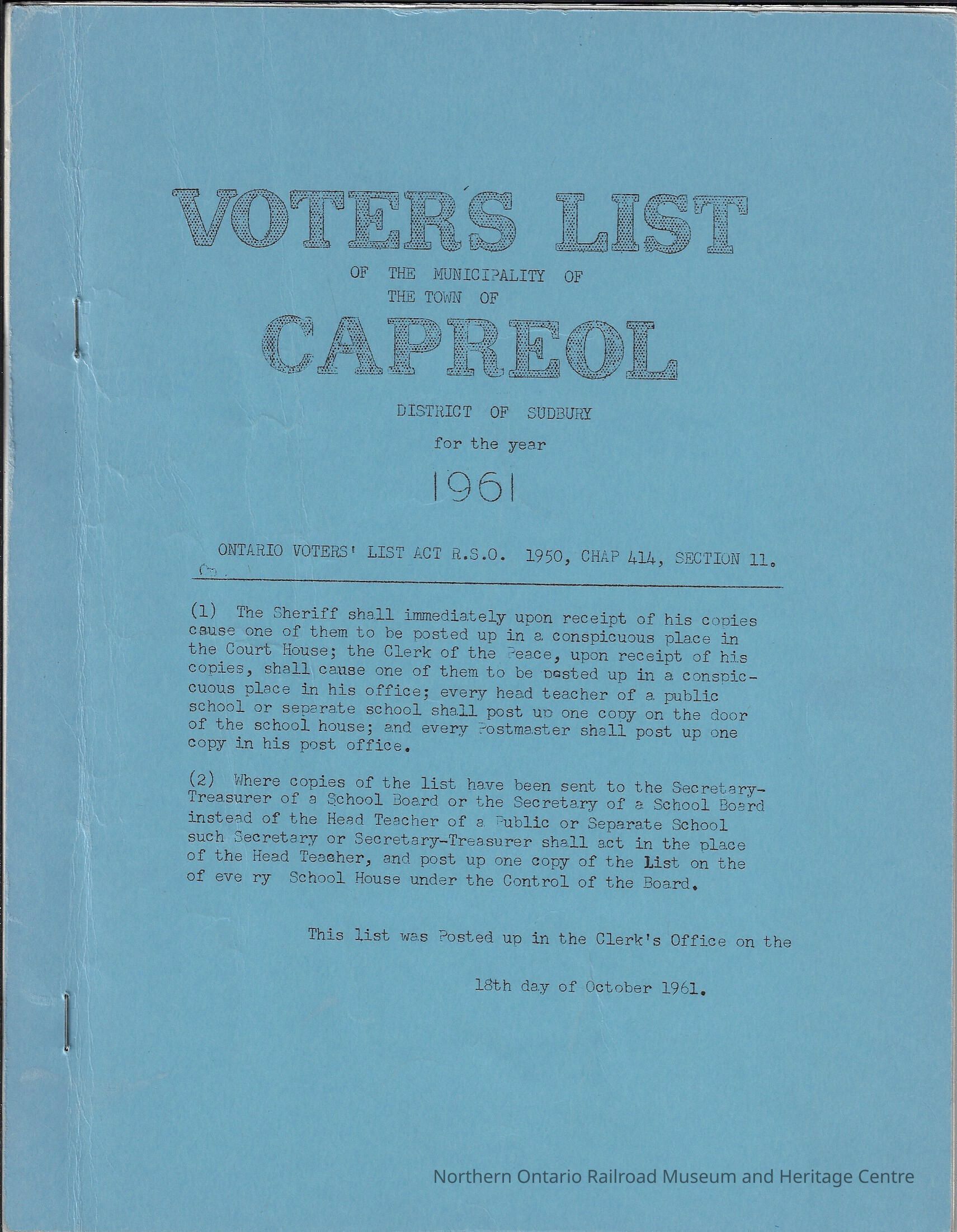Booklet, containing the list of eligible voters for the election of 1961 in the Town of Capreol. The election was for the municipal election of 1961. The lists were posted in the Clerk's Office on October 18th, 1961. The lists contain: roll number, name, occupation, lot, concession or street, qualification, school, jurisdiction, for each eligible voter.