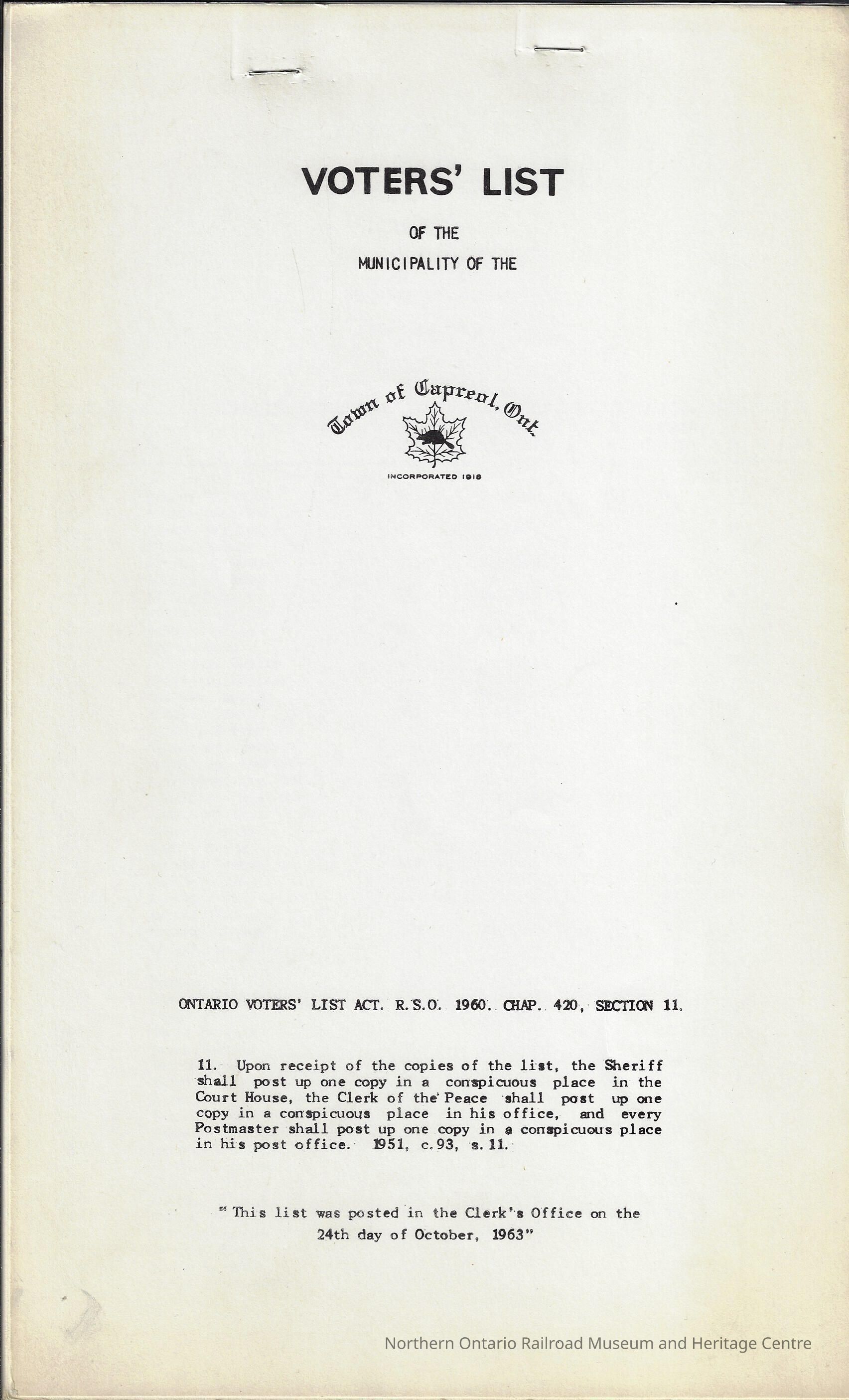 Booklet, containing the list of eligible voters for the election of 1963 in the Town of Capreol. The election was for the municipal election of 1963. The lists were posted in the Clerk's Office on October 24th, 1963. The lists contain: roll number, name, occupation, lot, concession or street, qualification, school, jurisdiction, for each eligible voter.