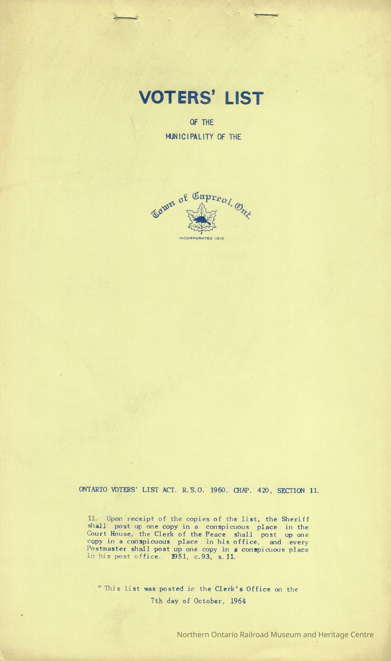 Booklet, containing the list of eligible voters for the election of 1964 in the Town of Capreol. The election was for the municipal election of 1964. The lists were posted in the Clerk's Office on October 7th, 1964. The lists contain: roll number, name, occupation, lot, concession or street, qualification, school, jurisdiction, for each eligible voter.