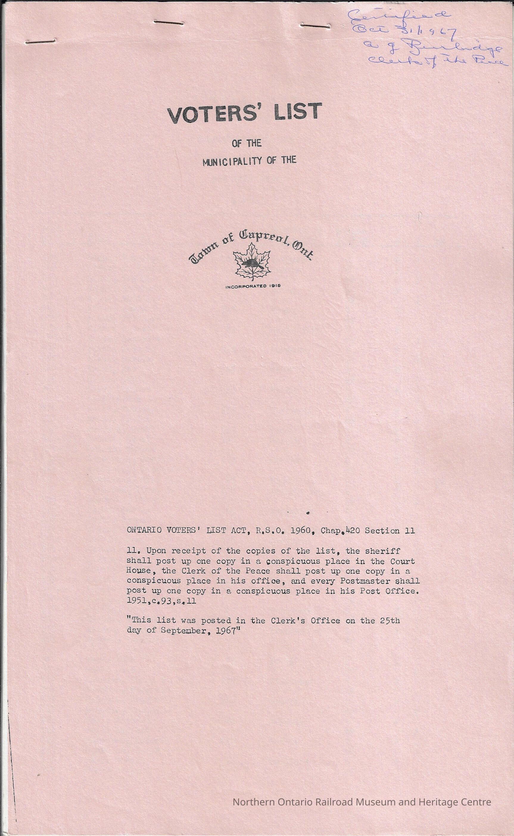 Booklet, containing the list of eligible voters for the election of 1967 in the Town of Capreol. The election was for the municipal election of 1967. The lists were posted in the Clerk's Office on September 25th, 1967. The lists contain: roll number, name, occupation, lot, concession or street, qualification, school, jurisdiction, for each eligible voter.