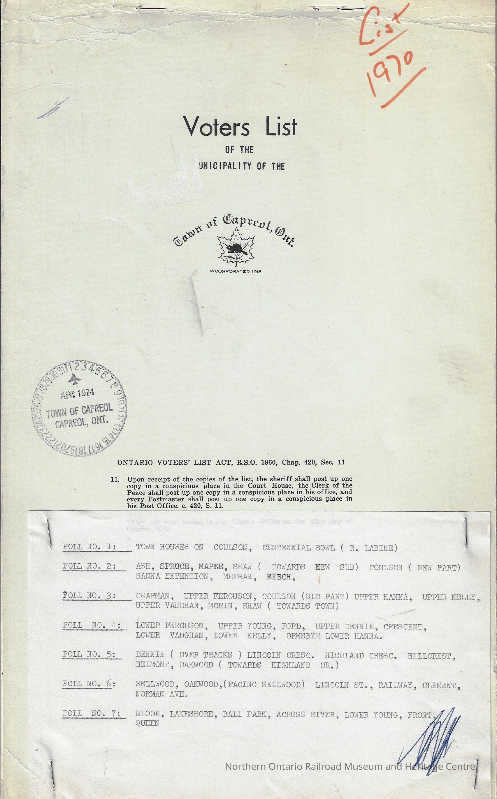 "Apr 1, 1974 Town of Capreol Capreol, ONT"