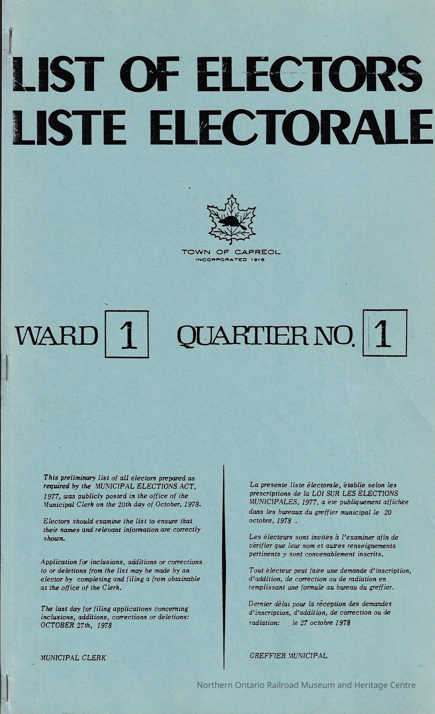 Booklet, containing the list of eligible voters for the election of 1978 in the Town of Capreol. The election was for the municipal election of 1978. The lists were posted in the Clerk's Office on October 27th, 1978. The lists contain: roll number, name, occupation, lot, concession or street, qualification, school, jurisdiction, for each eligible voter.