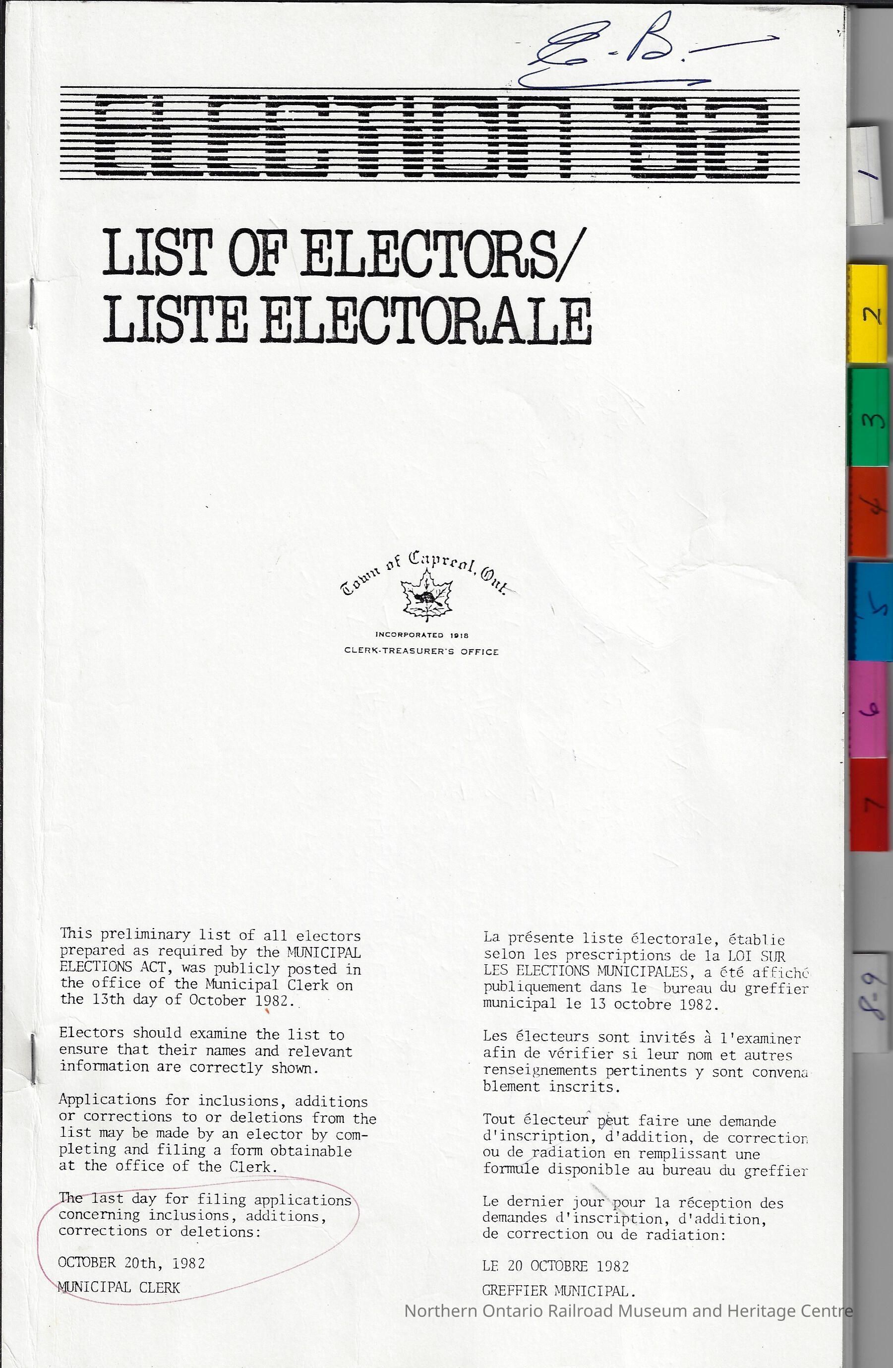 Booklet, containing the list of eligible voters for the election of 1982 in the Town of Capreol. The election was for the municipal election of 1982. The lists were posted in the Clerk's Office on October 20th, 1982. The lists contain: roll number, name, occupation, lot, concession or street, qualification, school, jurisdiction, for each eligible voter.