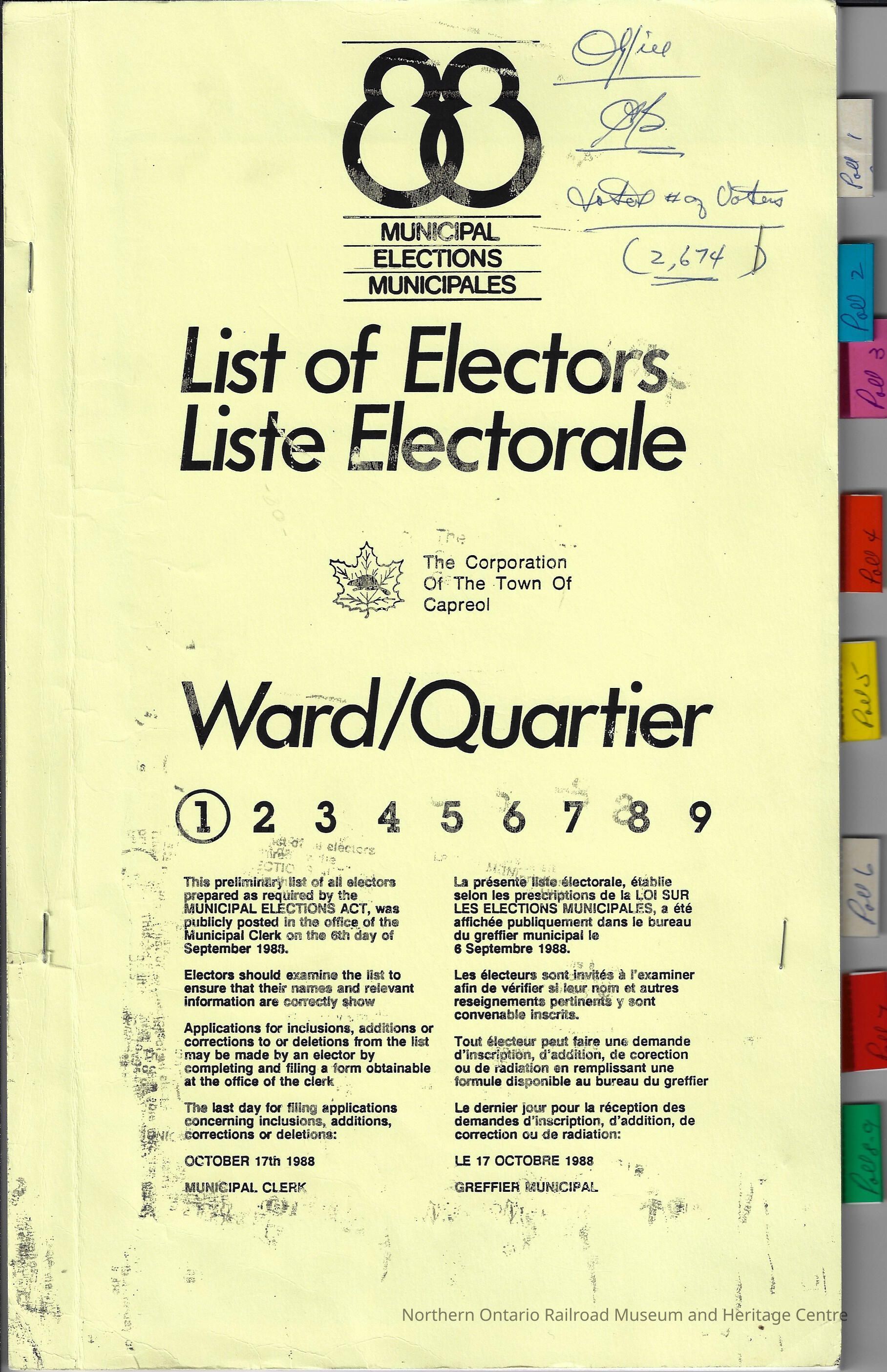 Booklet, containing the list of eligible voters for the election of 1988 in the Town of Capreol. The election was for the municipal election of 1988. The lists were posted in the Clerk's Office on October 17th, 1988. The lists contain: roll number, name, occupation, lot, concession or street, qualification, school, jurisdiction, for each eligible voter.