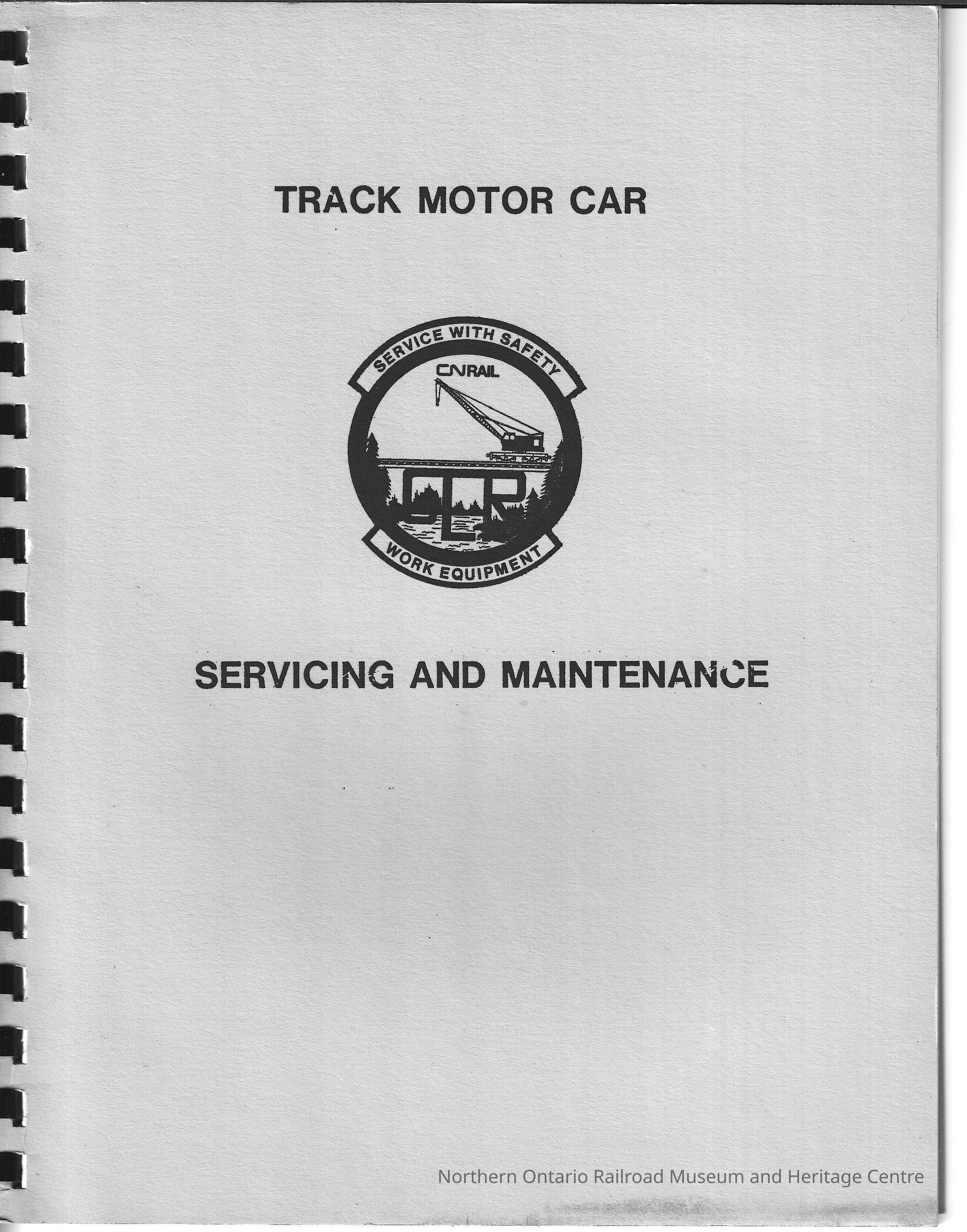 Book, manual for servicing and maintaining Canadian National track motor cars. Includes: safety, forward, maintenance categories, daily inspection and maintenance, brakes, adjustment brakes, gasoline levels, gas tank, wheel, sediment bowl, rail sweeps, drive chain, transmission levers, lights, general engine check, engine oil, inspection log, chart, weekly inspection and maintenance, air cleaner and maintenance, battery and safety precautions, boosting battery, clutch, cooling system, chain and sprocket, exhaust system, general inspection, inspection log, chart, monthly inspection and maintenance, bearings axles and wheels, calliper wheels, greasing TMC, changing engine oil, transmission oil level, cleaning crankcase breather, check spark plugs, governor linkage, inspection log, chart, semi annual inspection and maintenance, change spark plug, change braker points, cleaning cooling system, flush gas tank, inspection log, chart, starting TMC, running TMC, stopping TMC, do's and don'ts, reference check, troubleshooting, commonly needed parts.