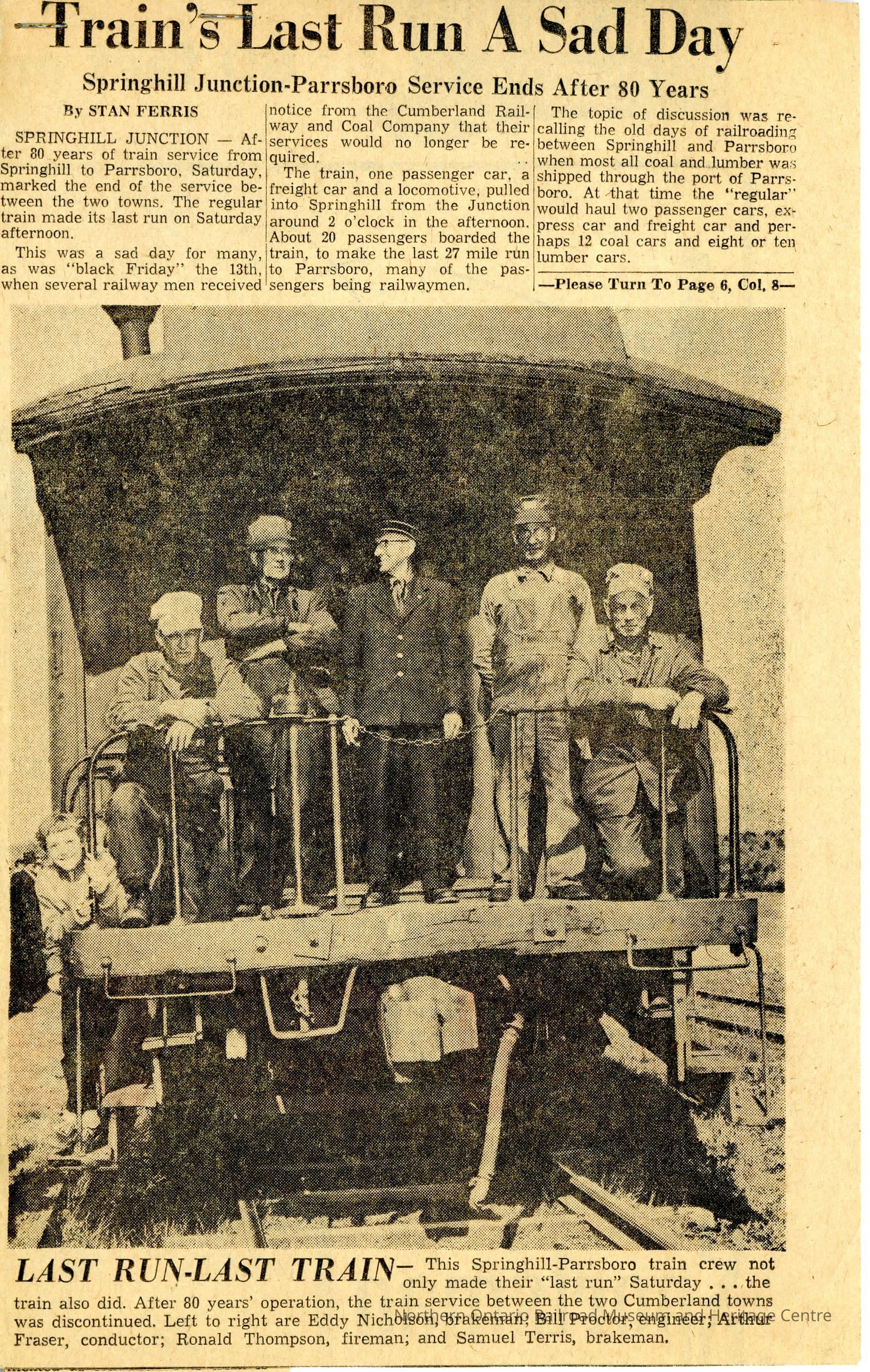 "Trains Last Run a Sad Day" Newspaper Article, detailing the "Springhill Junction-Parrsboro Service Ends After 80 Years".Collection
