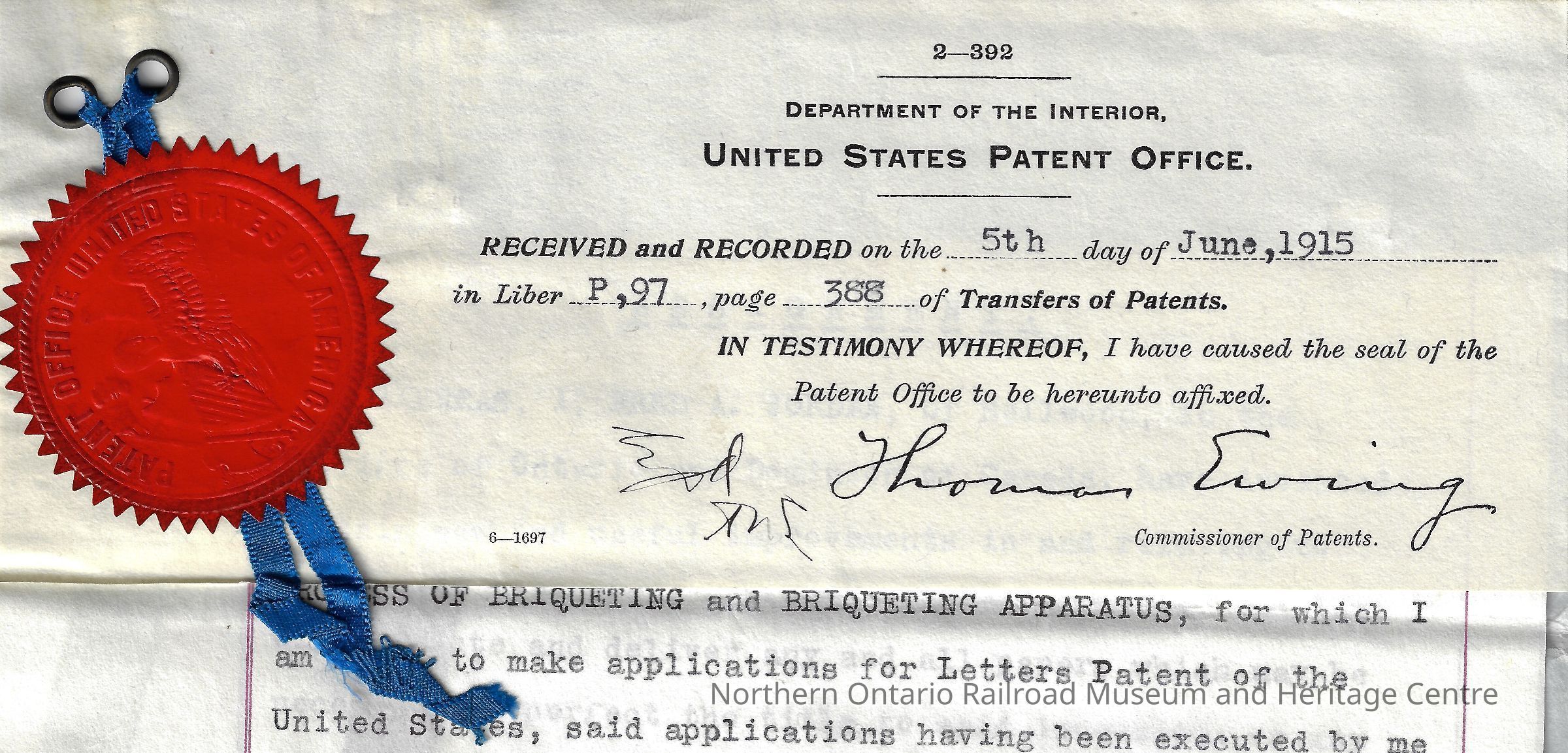 A series of documents relating to the transfer of Patents for Fred Allen Jordan's improvements in methods and apparatus for briquetting from Fred A. Jordan to Moose Mountain Limited. Signed on May 21st 1915 and recorded June 5th 1915 by the U.S. Patent Office. This transfer of Patents is signed by Fred Allen Jordan and J.M. McNamara, Notary Public. There is a witness testimony signed by E.C. Wakefield Consular Agent of the United States of America in North Bay, Ontario, affixed to the bottom of the last transfer document. To the left of Wakefield's signature the is the official watermark of the American Consular Agency North Bay, Nippising; an American Consular Agency stamp is affixed on top of this. Above is a red stamp, with the following words stamped in blue across it "Cancelled June 5 1915 U.S. Patent Office. There are four sheets, attached to a blue paper cover with blue and red ribbon. The official seal of the United States Patent Office is affixed on the left side of the first sheet, and the official seal of the American Consular Agency is affixed to the bottom left of the final sheet over red and blue ribbon.Collection