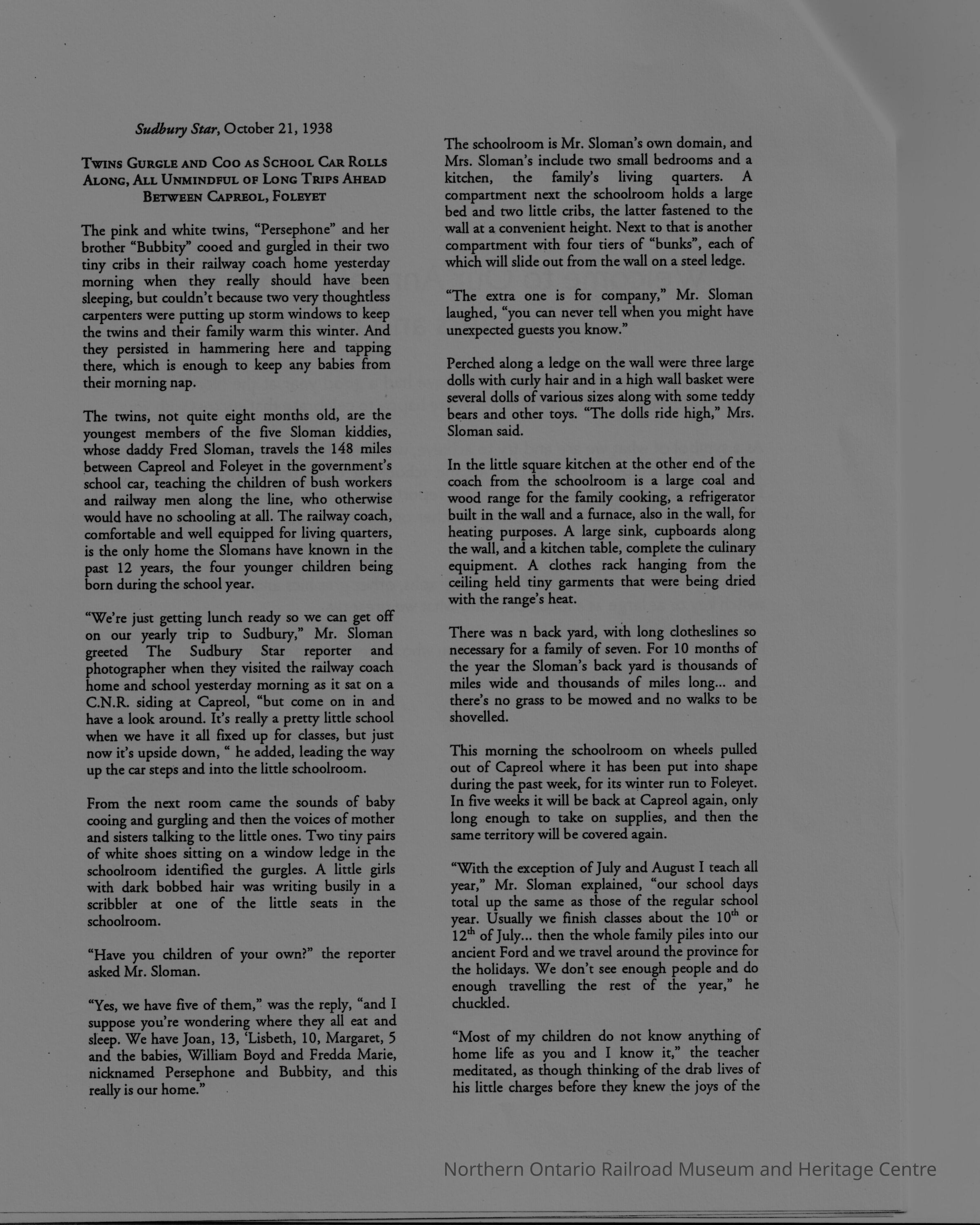 Sudbury Star article written in 1938 about the Sloman school car. Article features many quotes from Fred Sloman about teaching on a school car. The school car went from Capreol to Foleyet. Four pages long.Context