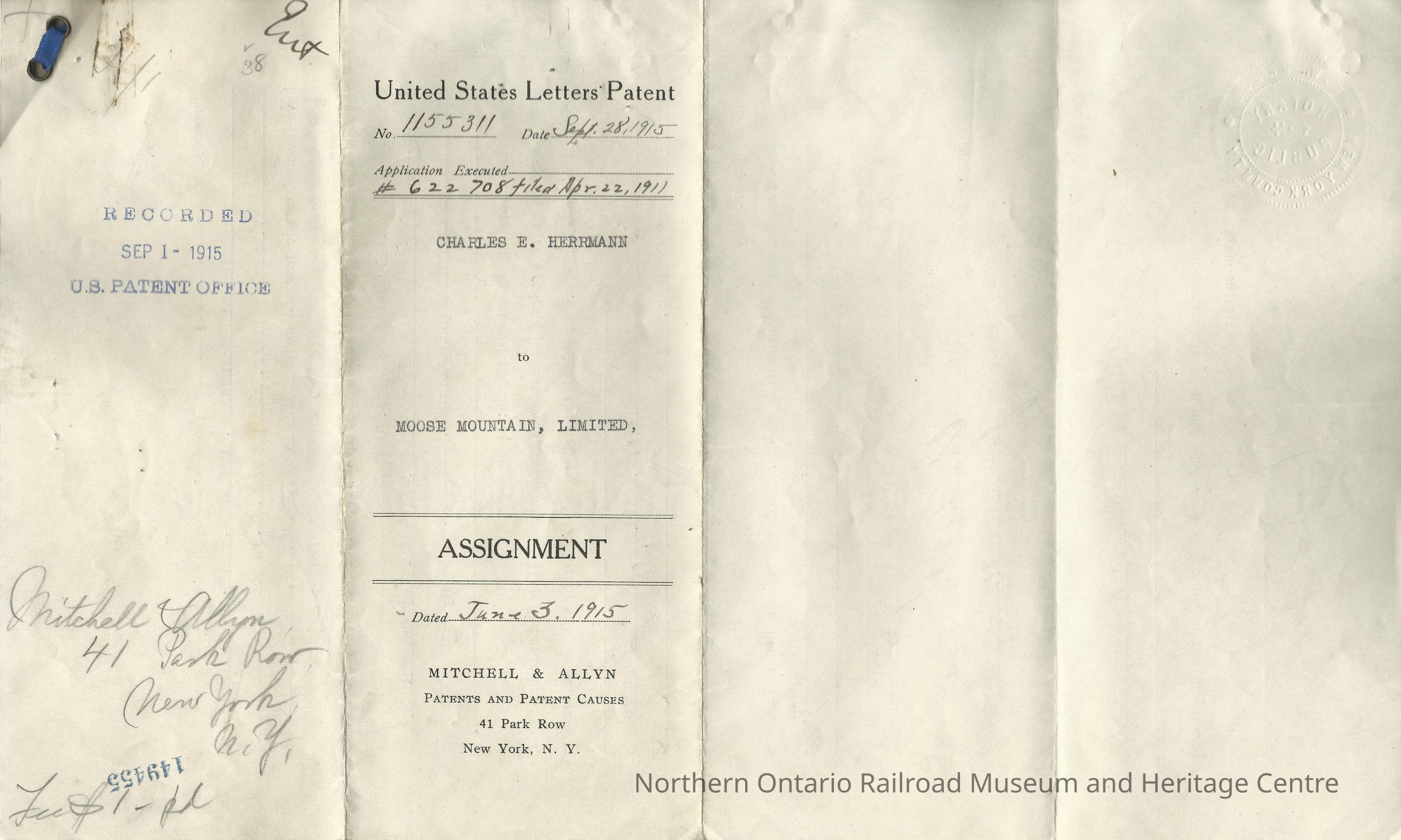 Letters Patent ffrom the United States Patent Office for Charles E Herrman for "improvements in briquetting ore concentrates", serial number 622708, filed on April 22nd, 1911. The document also includes an application from Moose Mountain, a Corporation of Sellwood, Ontario, Canada, to acquire an interest in this patent. The application was signed and delivered by Charles E Herrman on June 3rd 1915 in New York, NY, and acknowledged by (?) Bruce. The Assignment was printed by Mitchell & Allyn Patents and Patent Causes, 41 Park Row, New York, NY., and recorded on Sept. 1st 1915 by the United States Patent Office. There is a seal printed on the bottom left corner of the application with the words "Notary Public" in the middle, and " O.W.W.(?) Bruce New York County" around the outer circle. There is a slip fastened to the top left corner of the application from the United States Patent Office documenting the receipt and recording of the application, signed by Thomas Ewing, Commissioner of Patents. There is also an official United States Patent Office seal (red, with the image of an eagle with wings spread in the centre) on this slip, tied to the application with a blue ribbon. Patent no. 1155311.Context