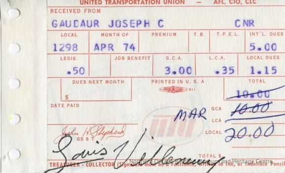 Receipt for union dues for the United Transportation Union. The receipt was for Joseph C. Gaudaur in April of 1974, for dues amounting to $20.00.