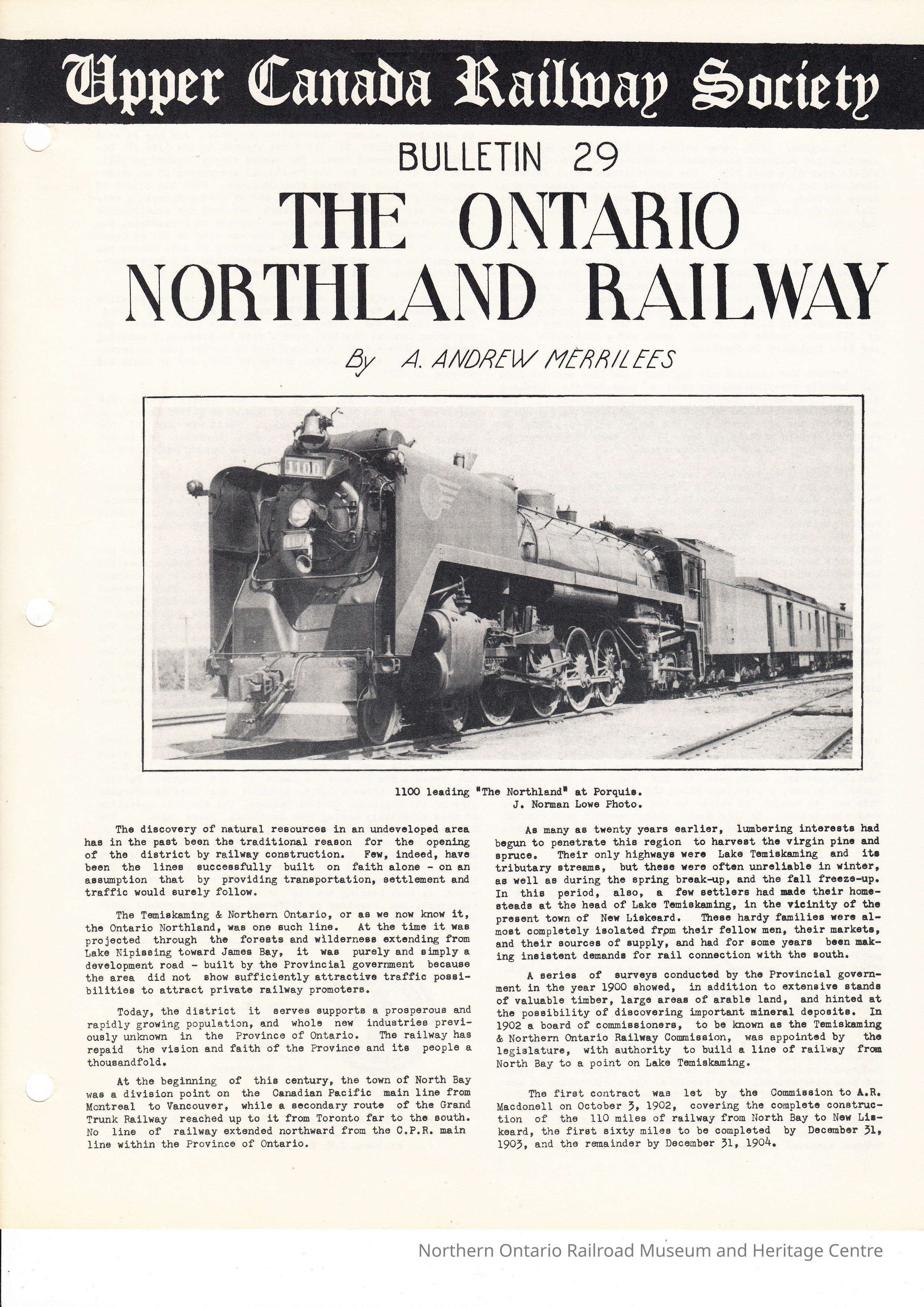 Upper Canada Railway Society Bulletin 29: The Ontario Northland RailwayEntry/Object ID