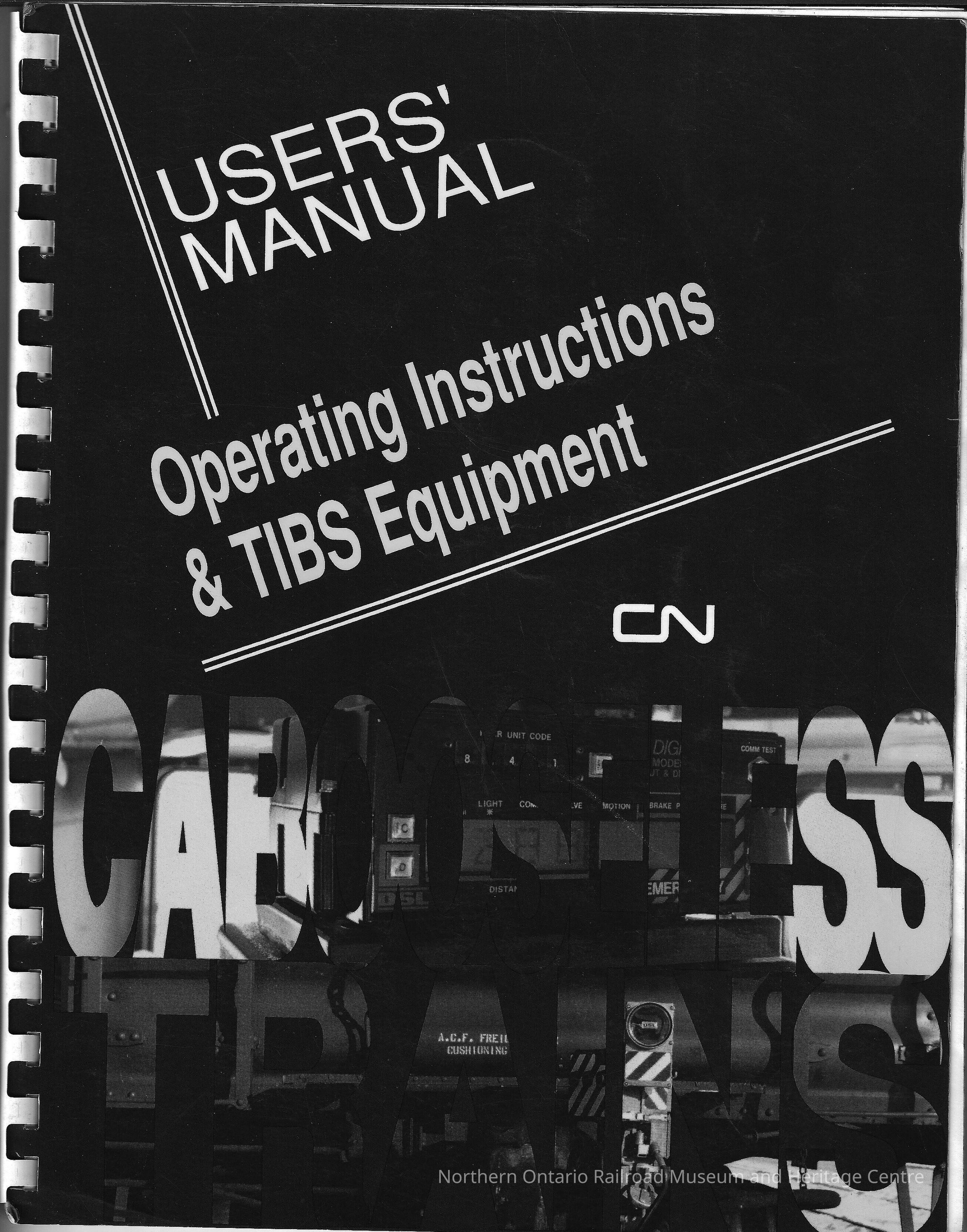 Book, manual for Canadian National's operating instructions and TIBS equipment for cabooseless trains. Includes: alarms, test buttons and displays, powering on and off, display, pre-instillation of SBU, instillation of SBU, connecting air lines, pre departure testing of SBU, battery changeout, marker light test, battery charging, IDU installation, CLU installation, power on sequence, ID code, functional test, shop track tests, pressure display, panel dimmer, motion display, emergency brake, communication test, odometer, distance measuring, rear-to-front communication, front-to-rear communication, emergency valve circuit, no-air, service, no data, I/O Error, train exception report