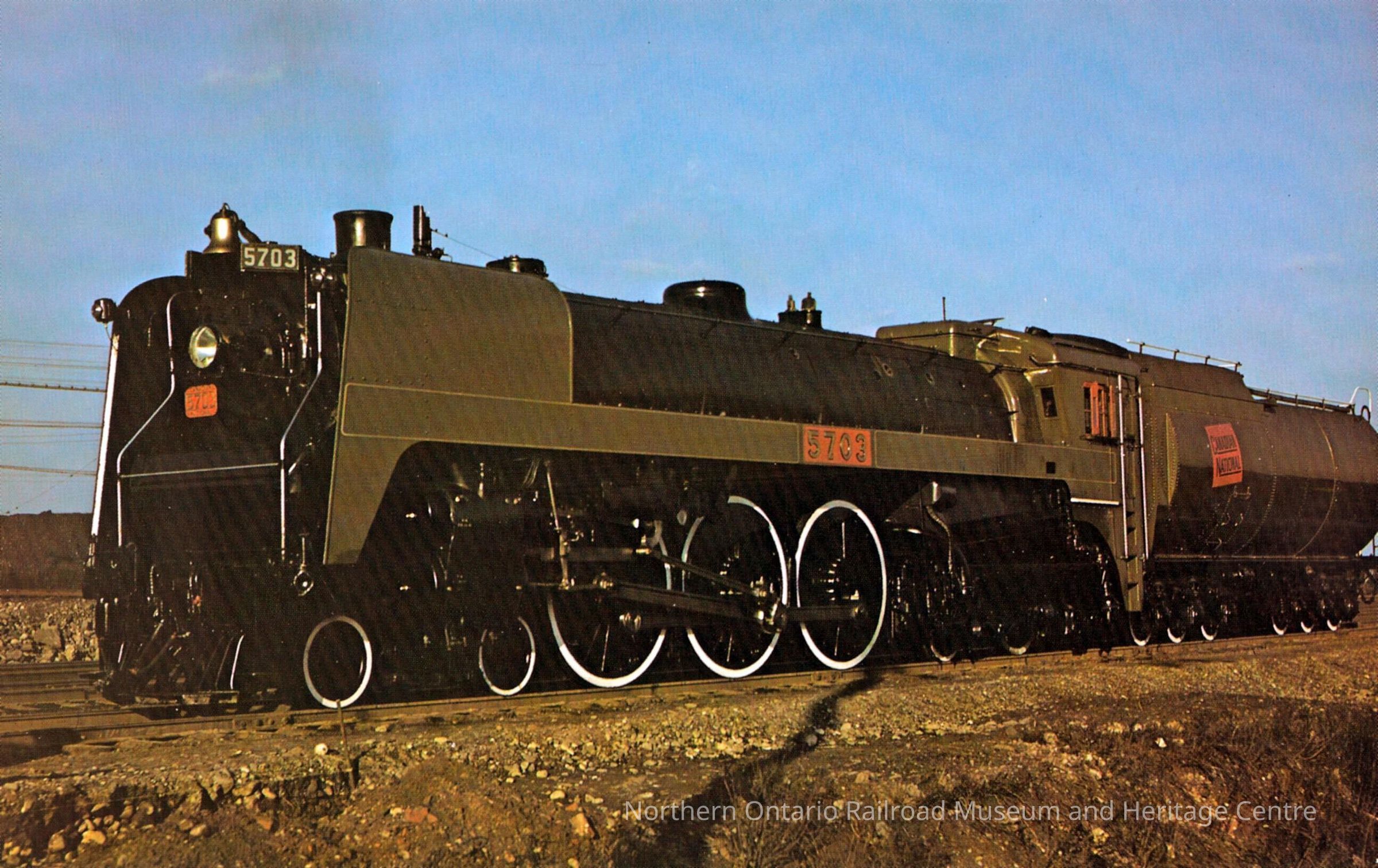 Vanishing Vistas oversized flashcard. The front shows a photomechanical reproduction of Canadian National Railways steam locomotive No. 5703. Pictured at Point St. Charles Yard, Montreal, Quebec, circa 1950.