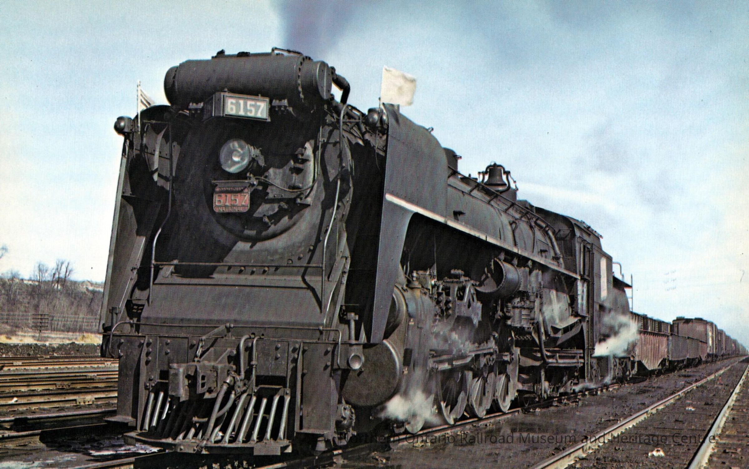 Vanishing Vistas oversized flashcard. The front shows a photomechanical reproduction of Canadian National Railways steam locomotive No. 6157. Pictured at the Turcot Yard, Montreal, Quebec, circa 1955.