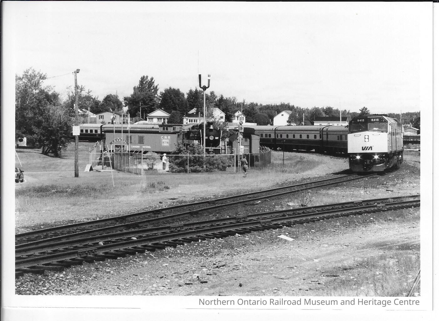 Photograph showing the Super Continental Train passing through Capreol towards Western Canada. Prescott Park is also visible, showing what would later become the Northern Ontario Railroad Museum and Heritage Centre.Collection