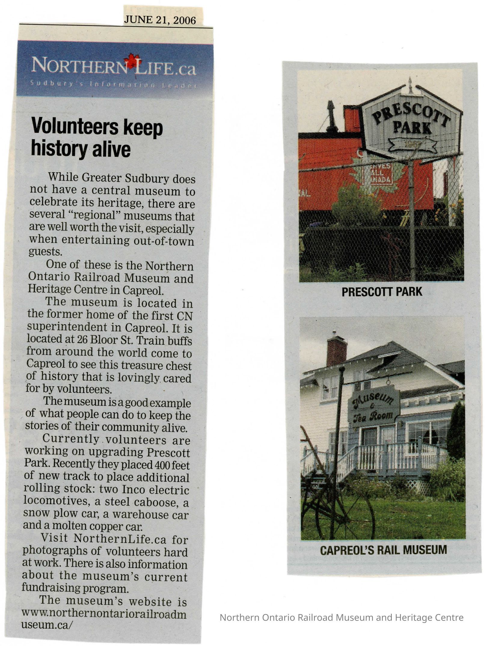 "Volunteers keep history alive" in NOrthern Life, June 21, 2006Description