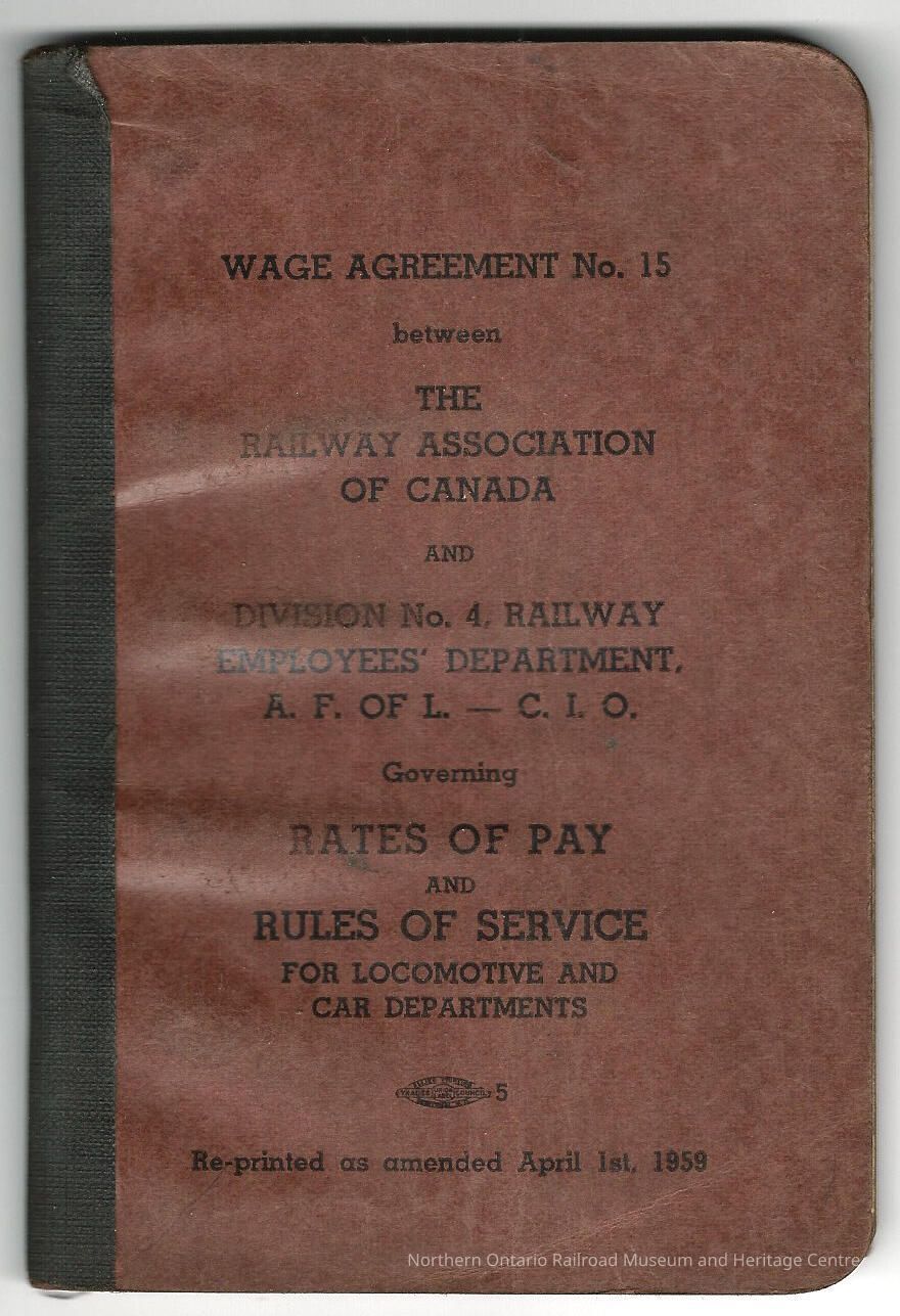 Book, wage agreement No. 15 on rates of pay and rules of service for locomotive and car departments. It was reached between the Railway Association of Canada and Division No. 4 Railway Employees. It goes for: Canadian National, Canadian Pacific, Dominion Atlantic, Esquimalt and Nanaimo, Northern Alberta, Ontario Northland, Quebec Central and Toronto Hamilton and Buffalo. It covers: hours of work, overtime, assignment of rest days, relief assignments, work on assigned rest days and legal holidays, Sunday and Holiday work, overtime and calls, emergency calls and wrecking service, equalizing overtime, temporary transfers, changing shift, road work, road work employees paid monthly, hourly rated employees away from home station, filling vacancies, working master mechanics and foremen, preference day or night shifts, vacancies preference jobs, promotion to foremen, promotion to leading hand, seniority of employees transferred, leave of absence, absence from work, faithful service, attending court, paying off, reduction of staff, laid off men securing work elsewhere, laid off men transferring to other points, employees required to work when shop is closed, seniority, assignment of work, labourers performing helpers' work, electric and oxy-acetylene welders, temporary foremen, grievances, final disposition grievances, new employees, investigations, unjustly discharged, committees, qualifications for apprenticeship, seniority of apprentices, rates for mechanics and helpers, rate for apprentices, rate of pay for leading hands, ray of pay for operators, conditions of shops, injuries, bulletin boards, shop trains, free transportation, protection of employees, emery wheels and grindstones, scrapping work, signal protection, blowing off locomotives, smoke jacks, lighting equipment, checking in and out, jurisdictional understanding, procedure, duration of agreement, revision of rules, scope of general and special rules, machinists' special rules qualifications, machinist's work, miscellaneous