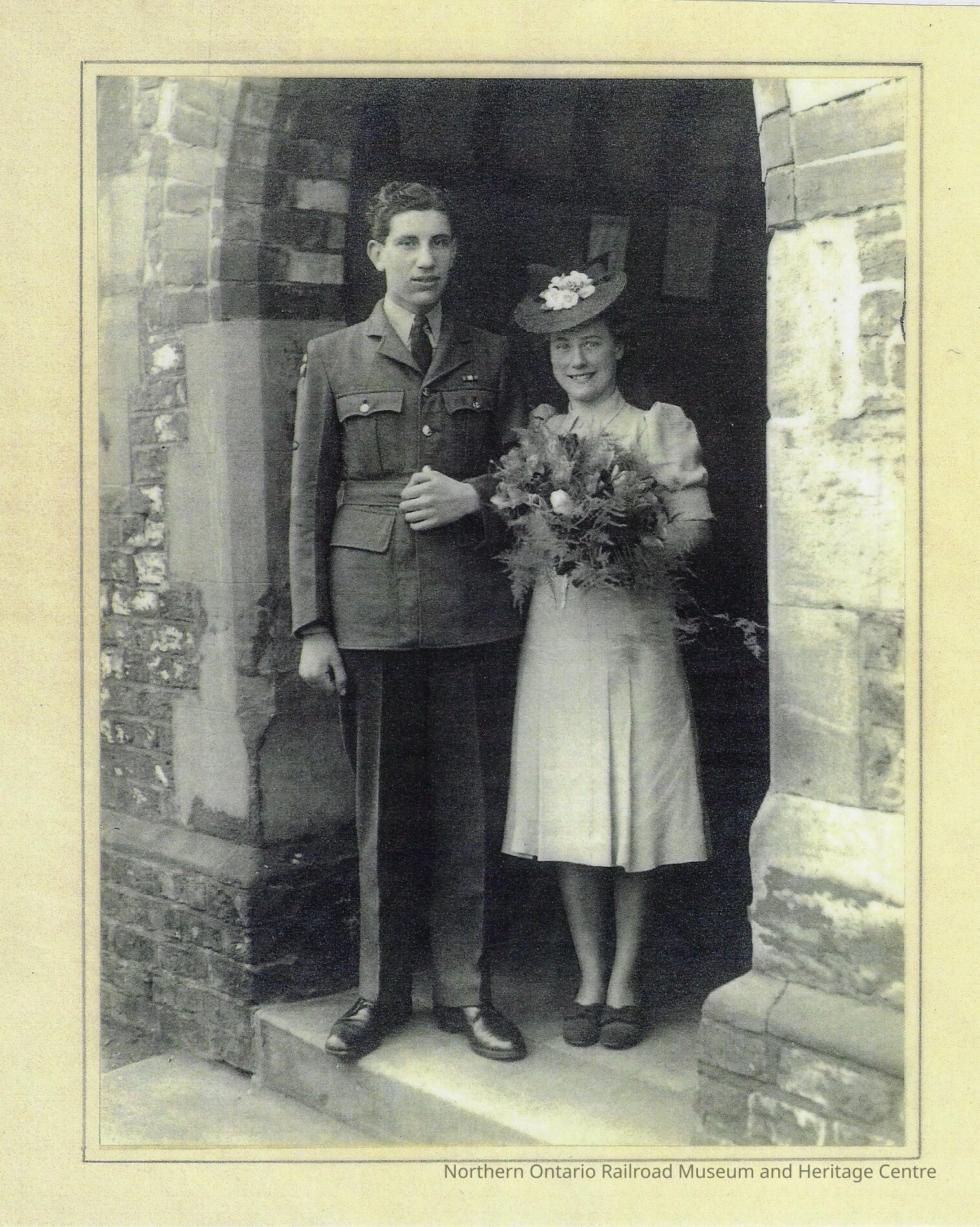 Photograph of Winifred and Tom Deciccio on their wedding day. Tom is dressed in a Canadian army uniform, Winifred is in a short dress, heels, and a hat with flowers on it. Winifred is smiling, Tom looks displeased. The couple are standing in an archway of a church.Photograph Details