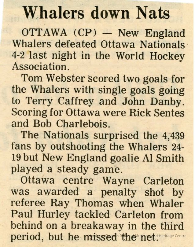 "Whalers down Nats" in the Ottawa Journal, unknown date. Ray Thomas mentioned giving penalty shot.Collection