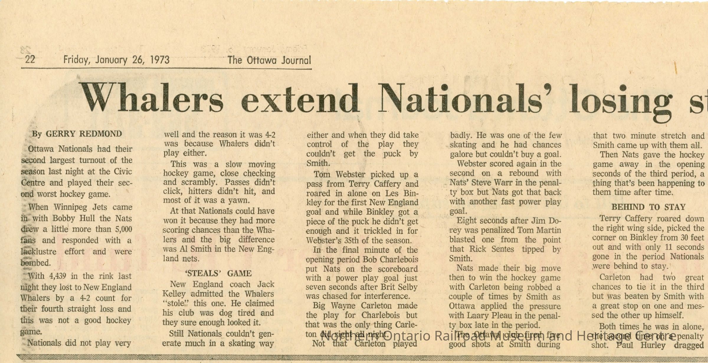 "Whalers extend Nationals losing streak to four" in Ottawa Journal, January 26, 1973Description