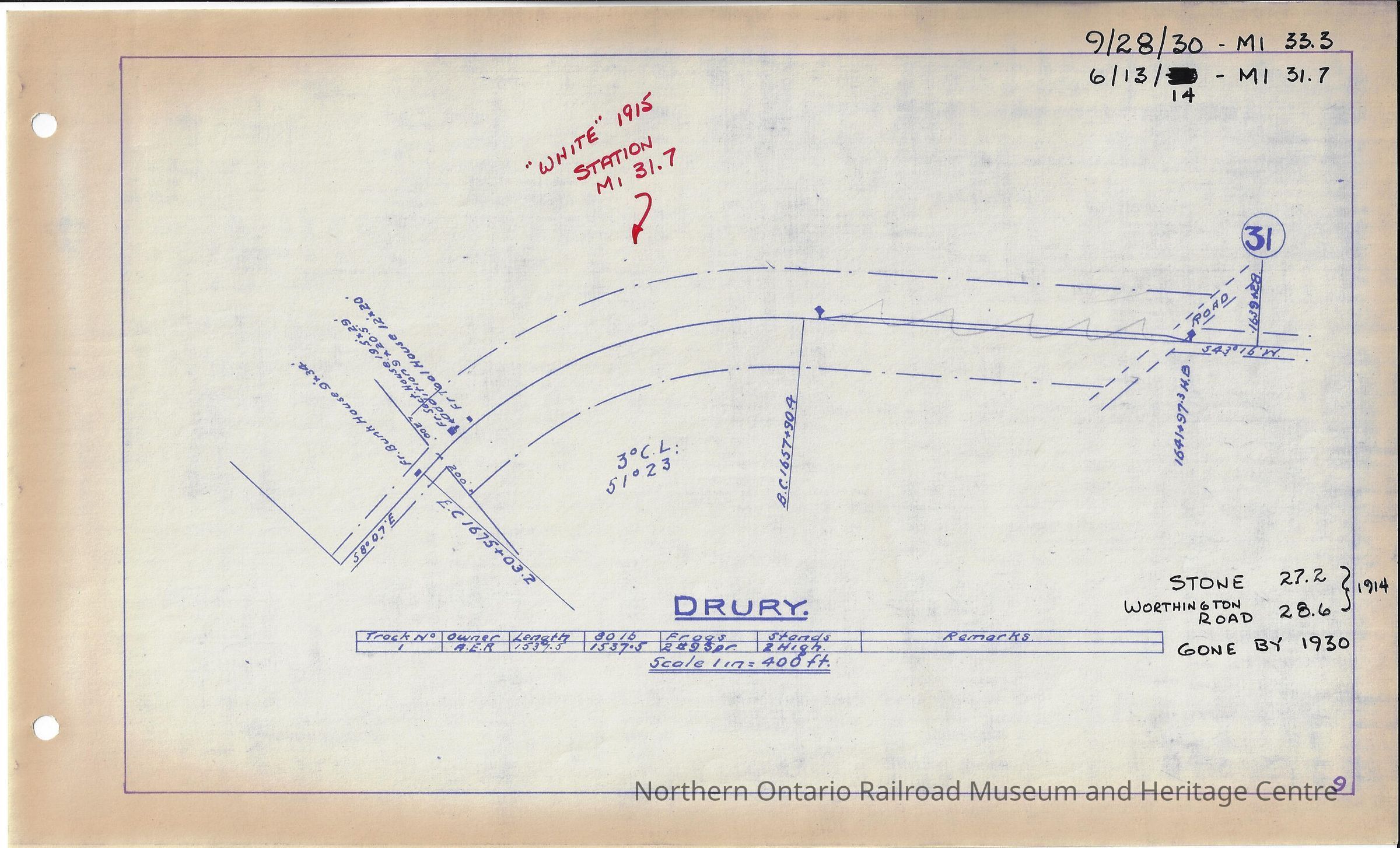 Rail yard plan of the Algoma Eastern Railway's Drury yard. Contains a layout of the rail yard as well as: track numbers, owners, lengths, weights, frogs and stands. Done by AER as part of the longterm lease that CPR began in 1930, taking over the small railway.