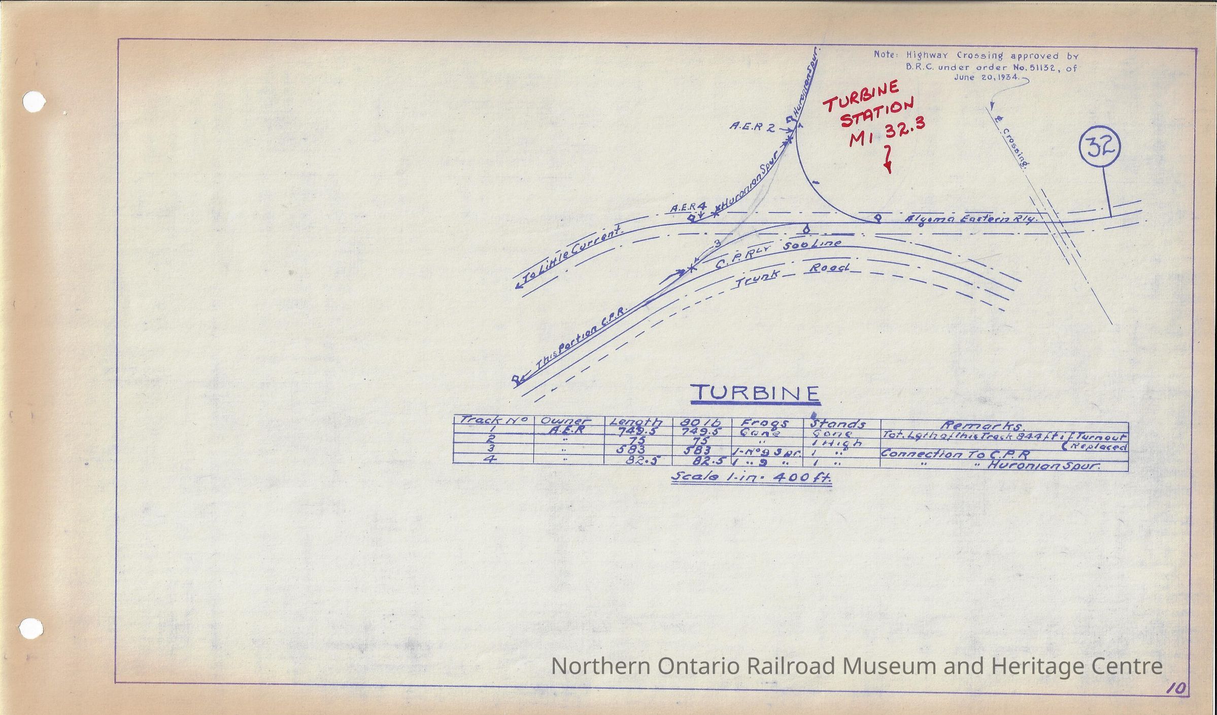 Rail yard plan for the Algoma Eastern Railway's Turbine yard. Contains a layout of the rail yard as well as additional information such as: track numbers, owners, lengths, weights, frogs and stands. Done by AER as part of the longterm lease that CPR began in 1930, taking over the small railway.