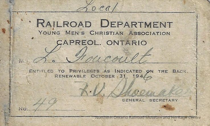 Membership card for the Young Men's Christian Association's Railroad Department. The membership card was given to L. Foucoult and it was valid until October 31, 1946.Creator