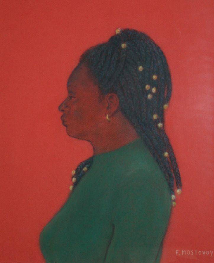 Side profile of a woman with dreads wearing a green shirt on a bright red background