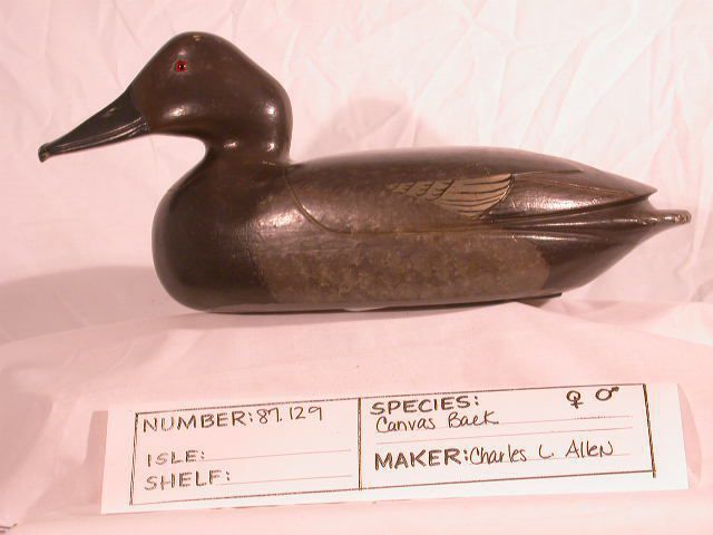 Hollow glass eyes, detailed carved bill, wings carved in detail; head inleaded, leather strap; stamped C. L. Allen, TNM #129, K , warp 1105, stamped 1105; 8 x 17 x 6 in.