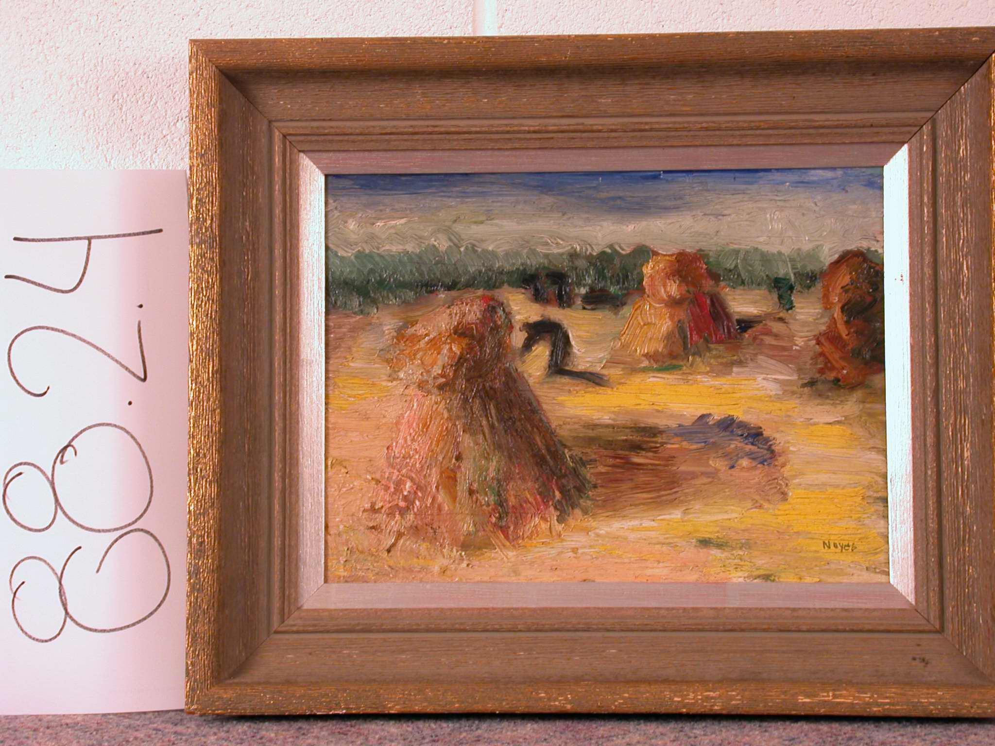 Description: Three heaps of corn stalks in a field, the closest being in the left foreground and the other two in the background on the center and right. A very sunny day is depicted, as the bright yellow and brilliant blue of the sky indicate. The paint is applied in a impressionistic way. Paint is crackling all over. Btm right- Noyes (signed in pen)Collection