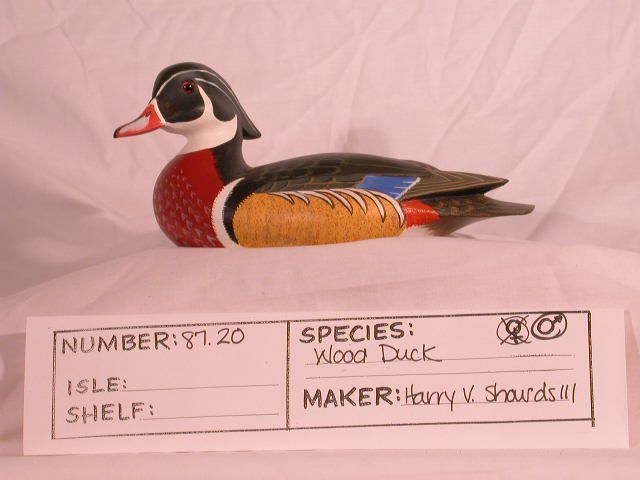 Wood Duck (drake), decorative decoy, signed H. V. Shourds 1975 Woodduck, raised wing carving, slight head tilt, glass eyes, stamped 960, labeled TMN # 20Collection