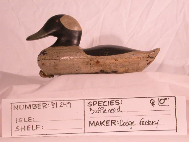 Tack eyes, groove behind head down back, head on slight shelf, 2 piece hollow with something inside, pad weight, strap, label H2, 249, stamped 901, original paint