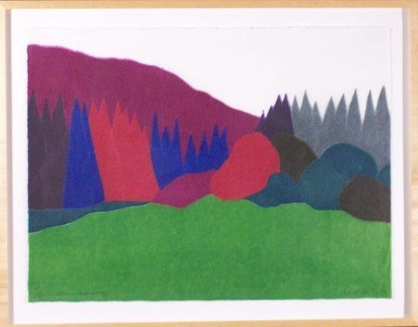 Framed work of green pasture with purple, blue, green and brown trees and purple mountains.