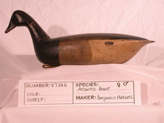 Head on shelf, blind eyes, carved bill detail, neck notch, 2 piece hollow body, inletted weight, leather strap, stamped H W Coin, 1549, labeled 266, written E10,original paint
