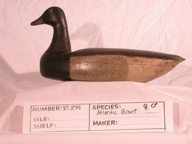 Blind eye, some bill carving, head on shelf, 2 piece hollow body with 2 dowel construction, inletted weight, stamped 1511, FWN, repaint, labeled E15, 274