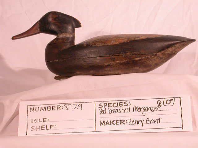 Two piece hollow body, pad weight, leather strap, head on shelf, chips at back of neck, stamped I2, labeled Henry Grant, Barnegat 1870; 5.75 x 16 x 5 in.