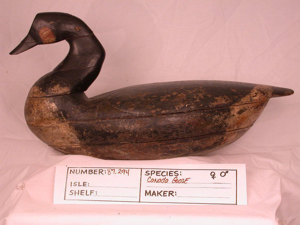 Broken neck, cracked bill, bottom board is rotted, conservation needed