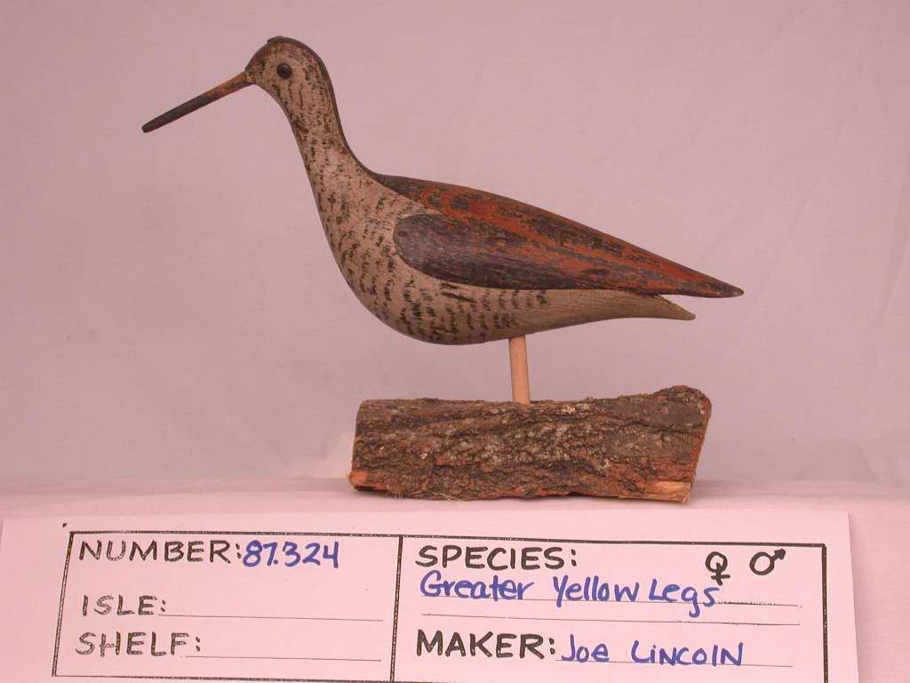 Tack eyes, with painted pupils, dowel through neck, inserted bill, some shot holes, solid body, hole in bottom for stick; written S218, J8; 5.5 x 10 x 2.25 in.