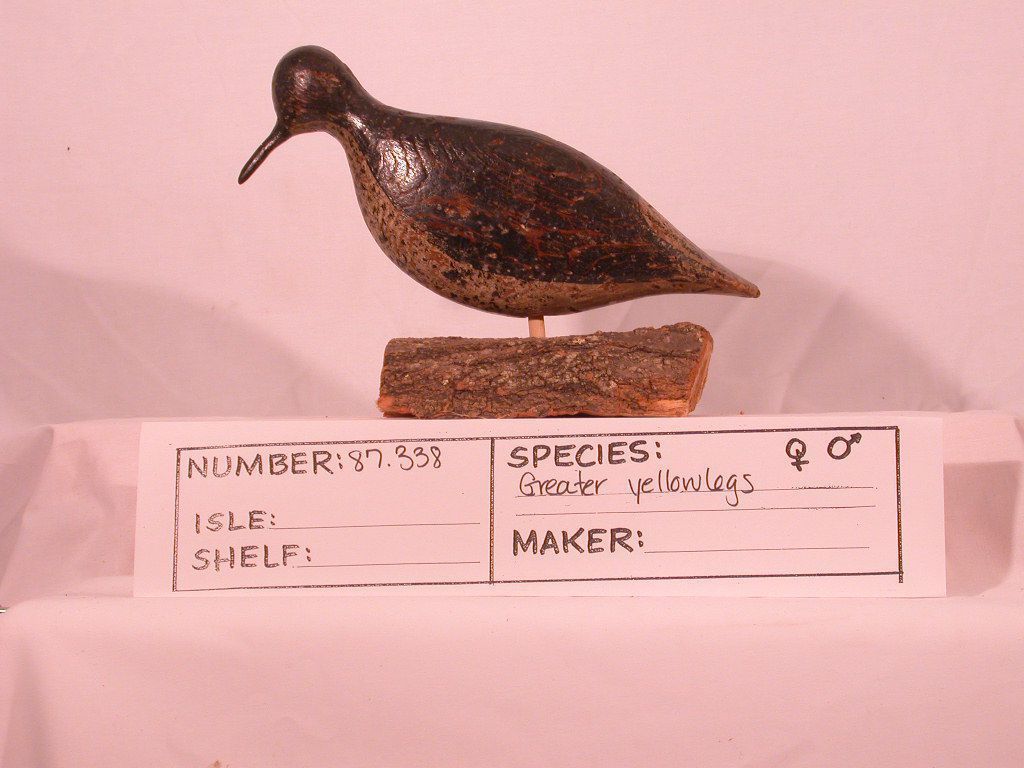 Flat sided body, blind eyes, bill inletted through head, many shot marks, hole in bottom for stick, knot missing in right side, written S-485, worn tail, original paint