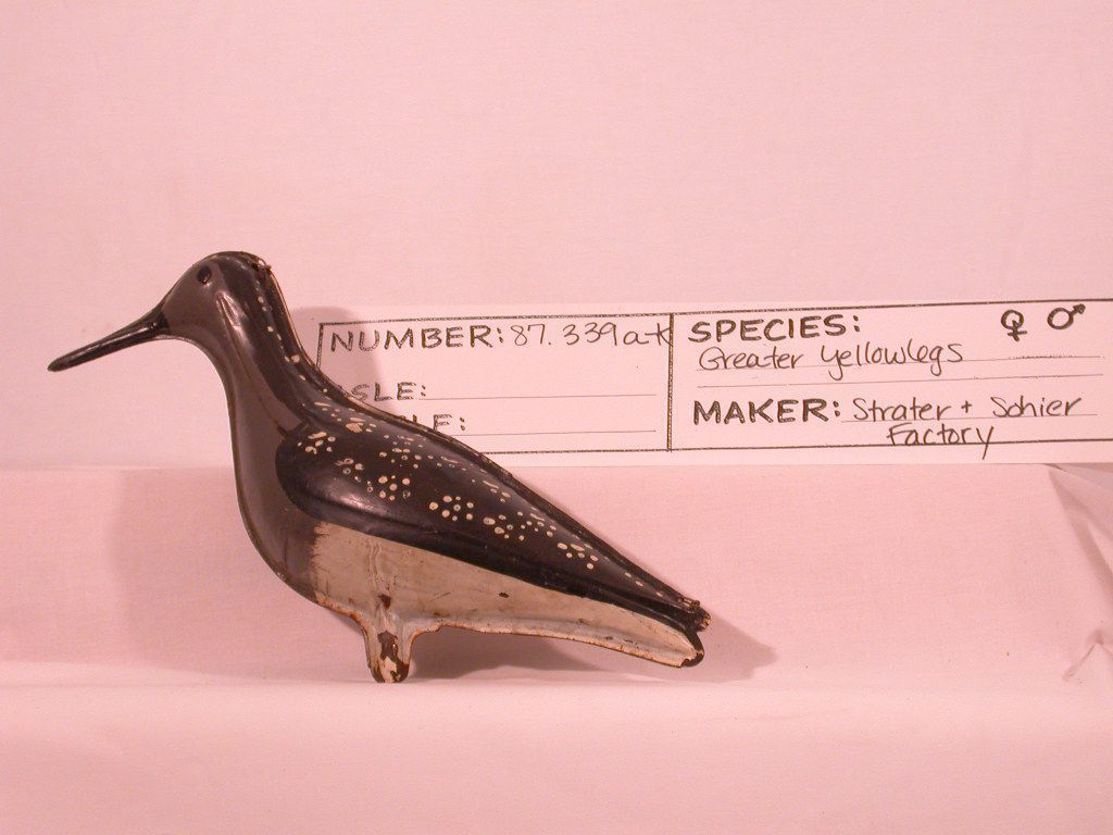 C-tin snipe decoy, 2 piece hollow, old repaint, hinged, shot holes in side, labeled S-515