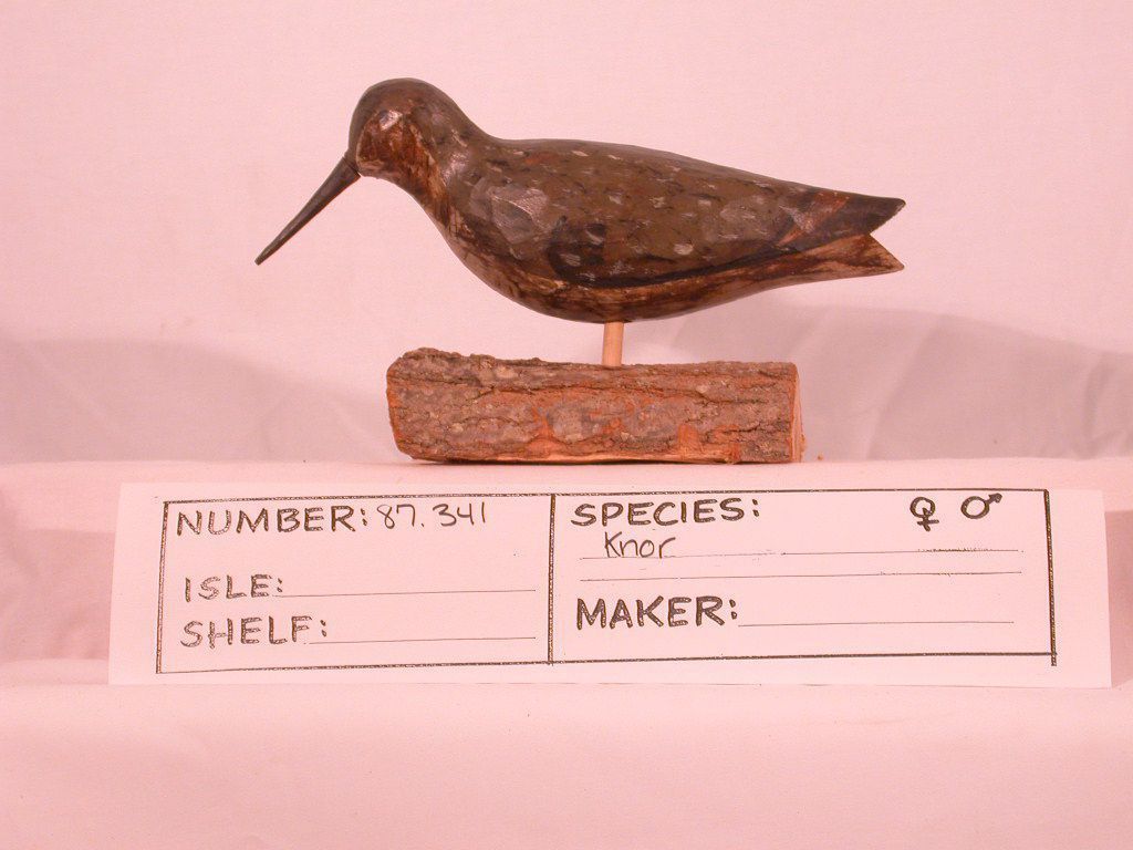 Original paint, solid body, split tail, inserted bill, painted eyes, whittled finish, hole in bottom for stick; written -3, 494, AA; 3.75 x 10 x 2.25 in.