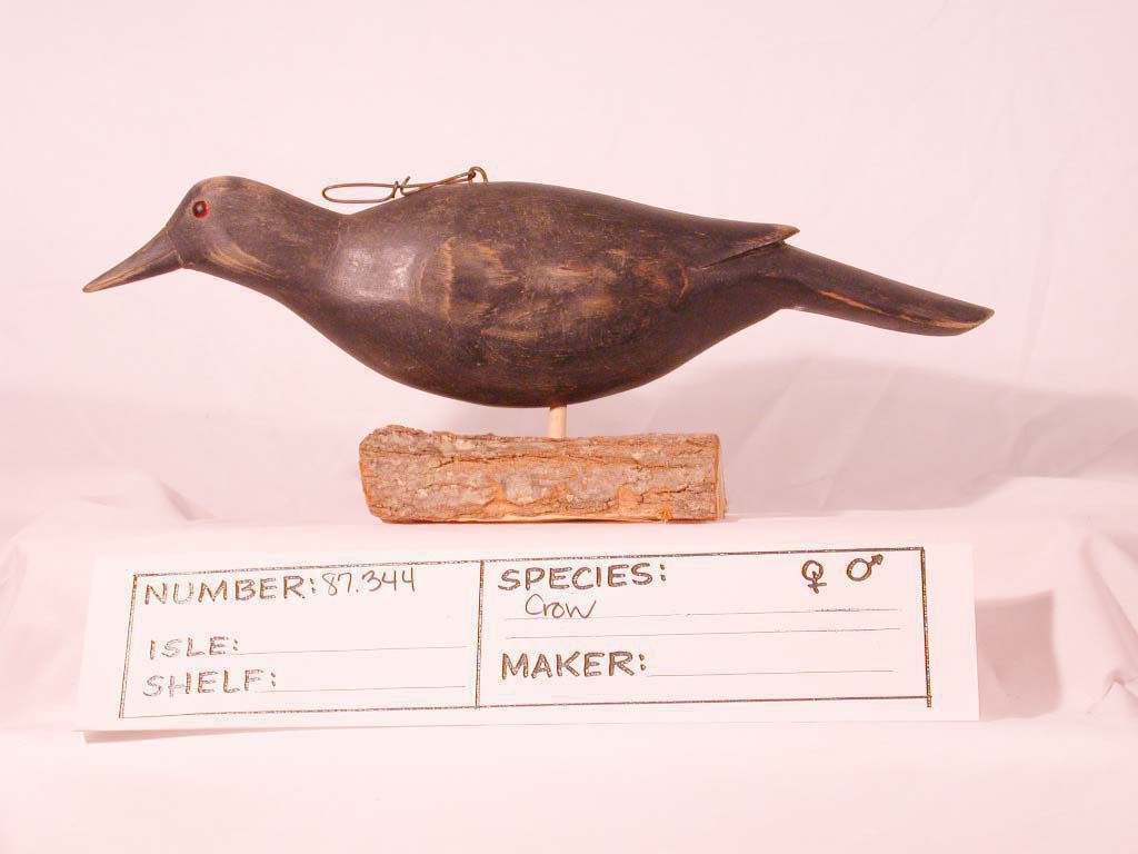 Solid body, inserted bill, glass eyes, flat sided, staple in back, raised wing carving, drooping tail, stamped 982, original paint, wornCollection